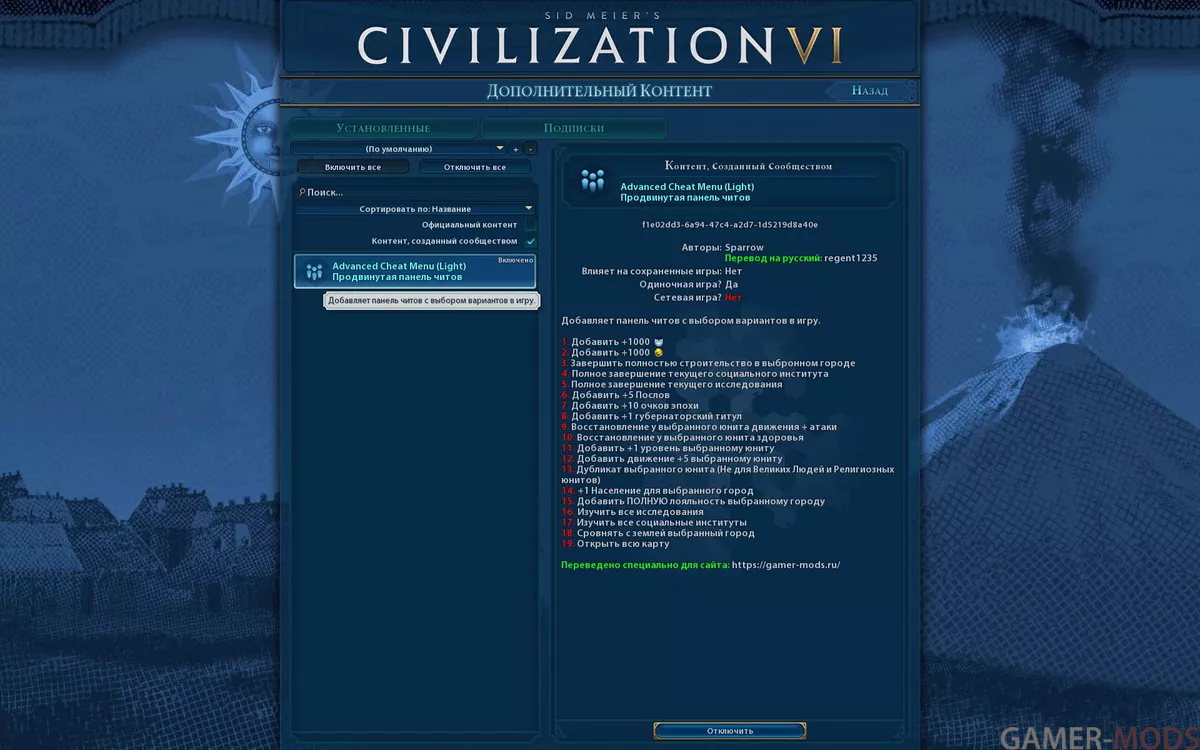 Распаковать архив и скинуть папку cheat_menu_panel_r_f_gs по пути: C:\Users\Имя пользователя\Documents\My Games\Sid Meier's Civilization VI\Mods