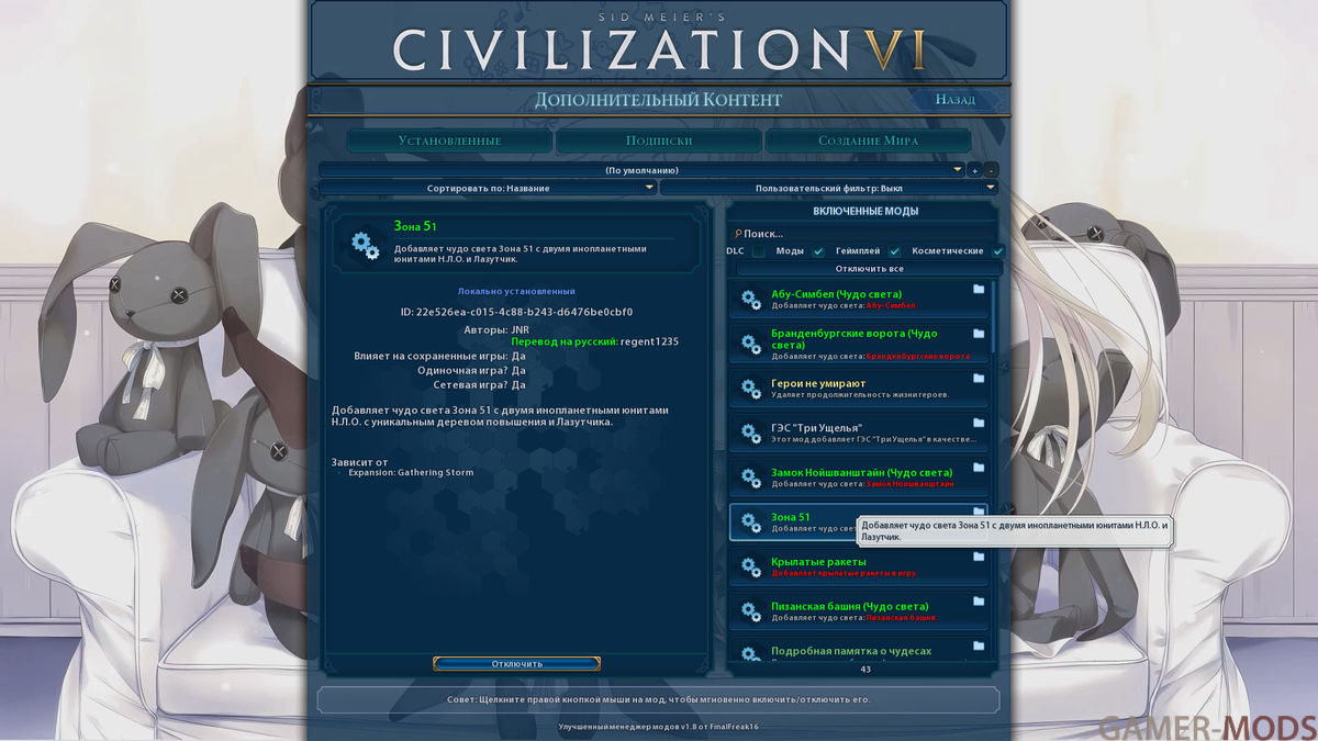 Распаковать архив и скинуть папку Area51 по пути C:\Users\Имя пользователя\Documents\My Games\Sid Meier's Civilization VI\Mods