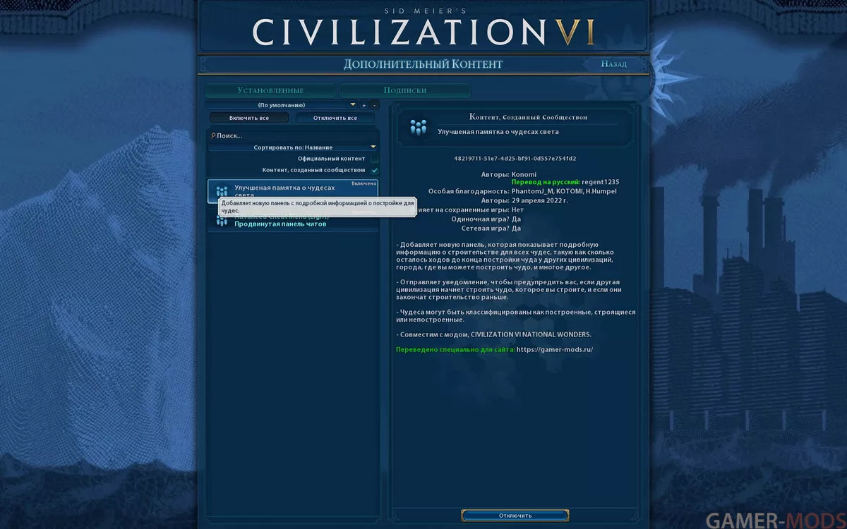 Совместим с модом, CIVILIZATION VI NATIONAL WONDERS.