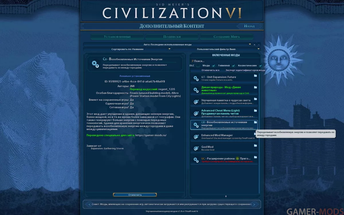 Распаковать архив и скинуть папку CB_Renewables по пути C:\Users\Имя пользователя\Documents\My Games\Sid Meier's Civilization VI\Mods