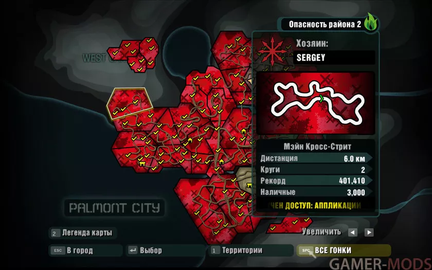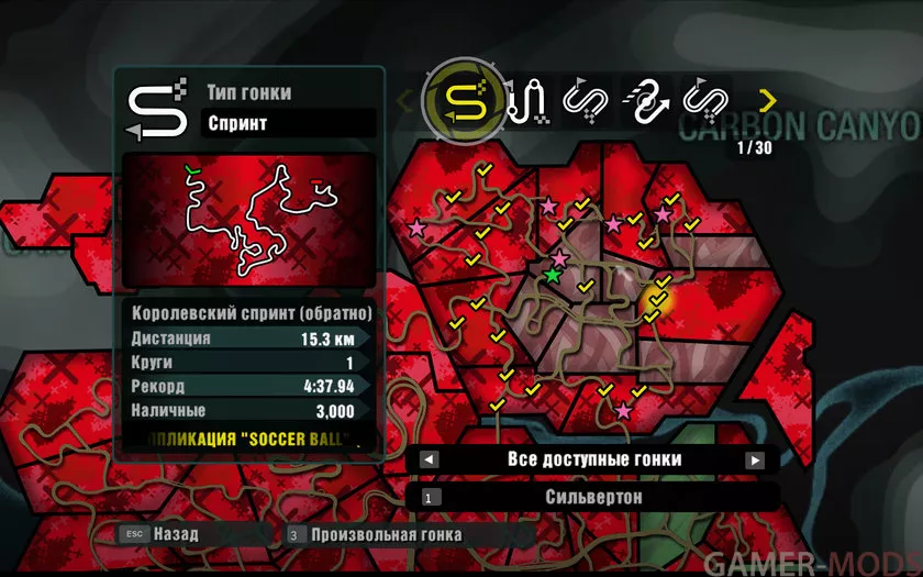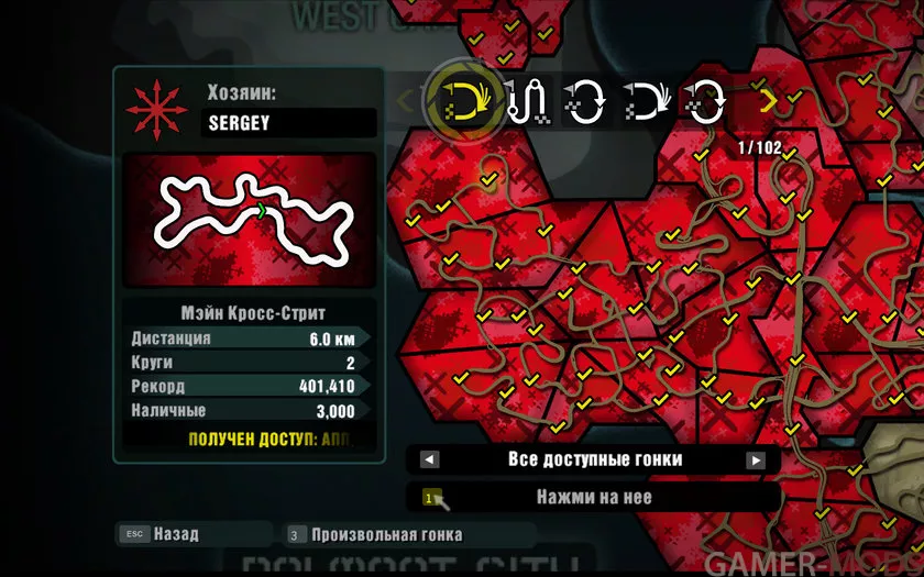Примечание. Не все гонки отображаются на глобальной карте. Для их прохождения следует при открытии карты нажать на Space -> потом нажимать на цифру 1 (клавишей или мышью) и выбирать регионы -> выбрать тип гонок. Скриншоты прилагаются.