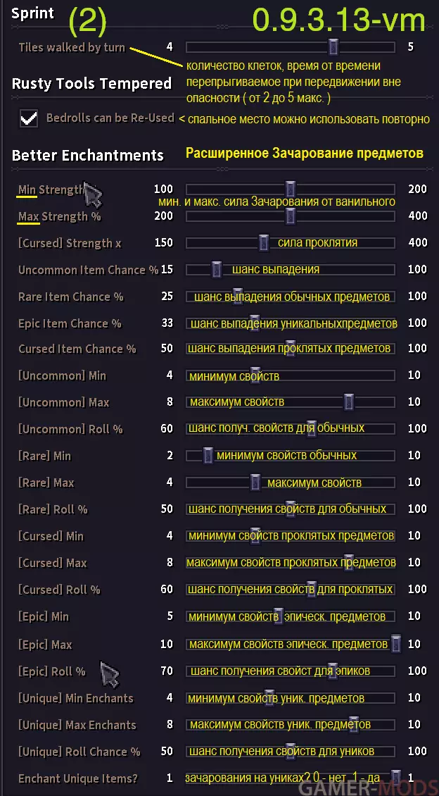 - Better Enchantments - улучшение зачарования оружия, брони и прочих шмоток... количество (от 1 и до 10) зачарок на оружии, одежде и украшениях, их величина (от 100 до 200% от изначальных значений) и шанс выпадения оружия (и прочих предметов) разного тира с тем или другим количеством зачарований (или проклятий, для проклятого) - всё настраивается вами! Перевод настроек смотри на скриншотах.