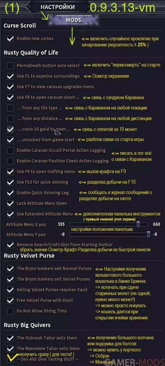 - Перед началом игры зайдите в раздел Настройки игры, находясь в главном меню, настройте по вашему усмотрению моды в разделе "Настрой моды" ( или "MODS" , если название раздела не переведено ), нажмите "Принять" это создаст файл сохранения настроек модов в основной папке с сохранениями игры, начните пробную игру, посмотрите как и что работает, снова настройте моды, как вам нравится, только потом начинайте вашу основную Игру! Потому что некоторые настройки потом уже не поменять! Многие можно менять и по ходу игры, но не находясь в процессе игры, а сохранив текущую игру и выйдя в Меню.