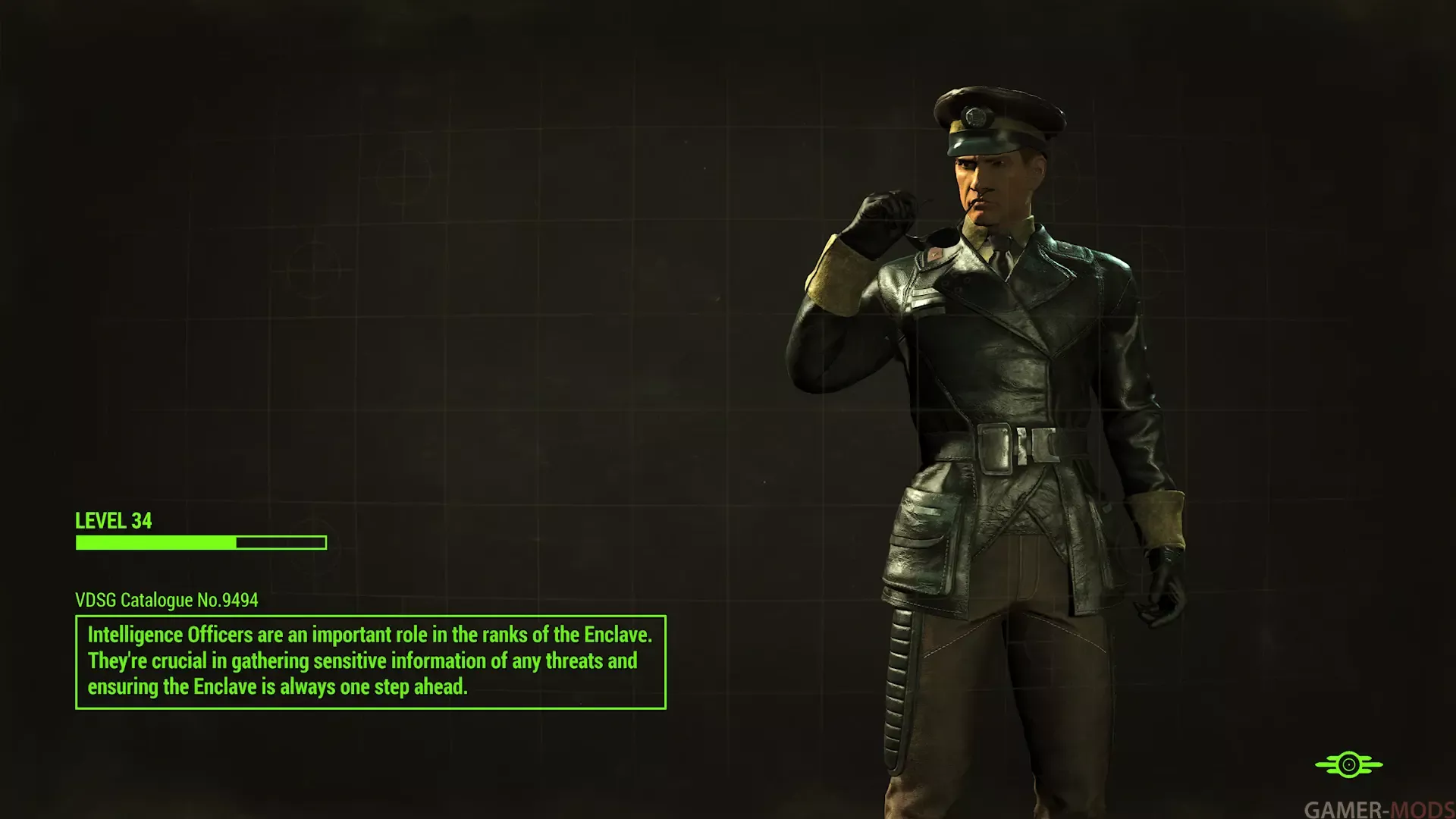 Скачиваем архив мода и устанавливаем через менеджеры модов или вручную, берем файлы EnclaveIntelOfficer.esp и кидаем в папку Data в игре.