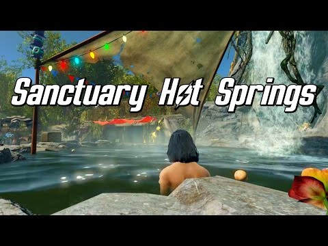 Недалеко от Сэнкчуари на берегу озера для игрока и друзей добавлено новое поселение "Горячий источник". Это так сказать мини поселение снаружи, и комфортабельное жилье бункер внутри, полностью настраиваемое. Идеально подходит для отдыха на природе, посидеть и поразмышлять в тишине в бассейне. "Горячий источник" изначально принадлежал одинокому поселенцу, вы можете воспользоваться его трудолюбием, а чтобы попасть внутрь бункера, Вам нужно найти ключ.