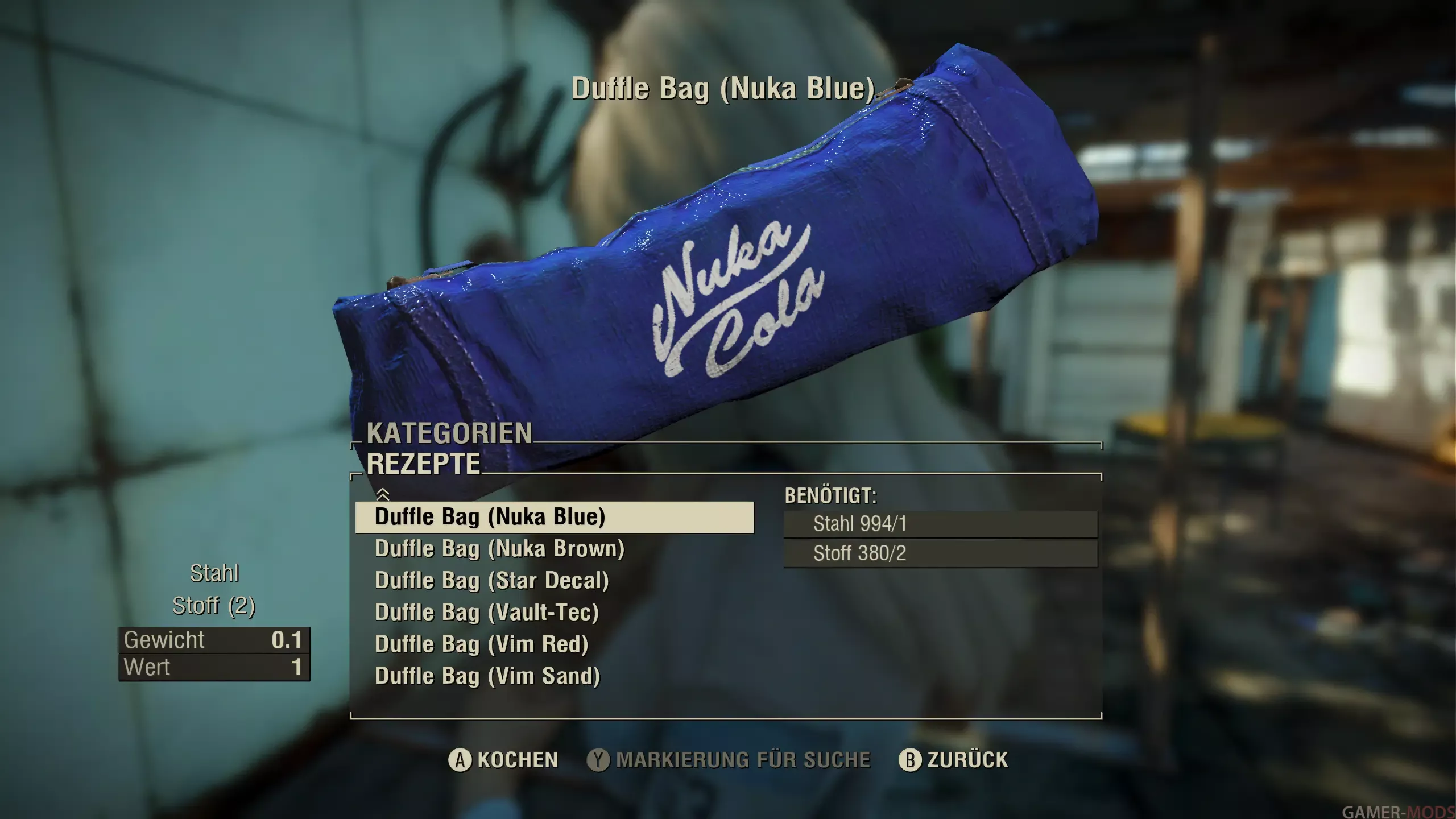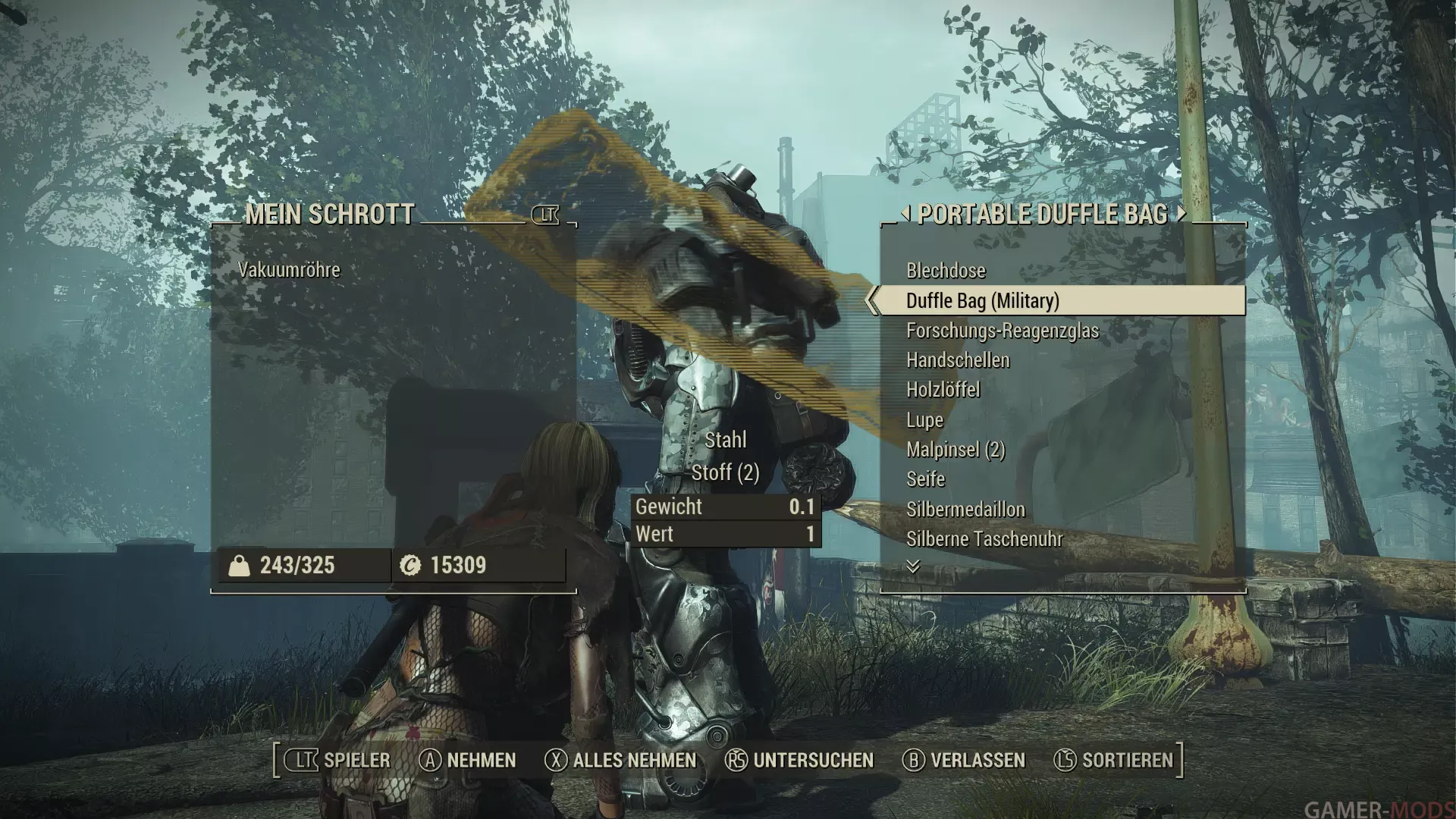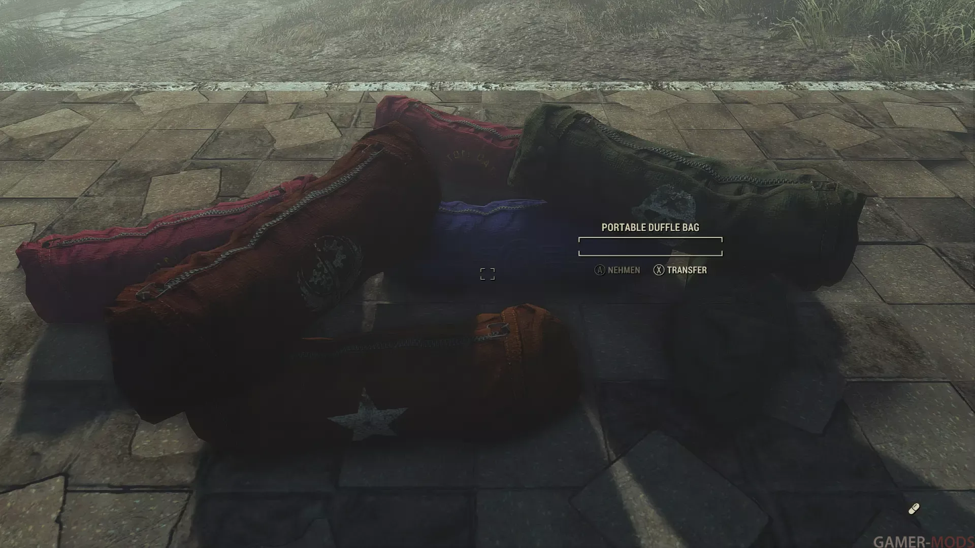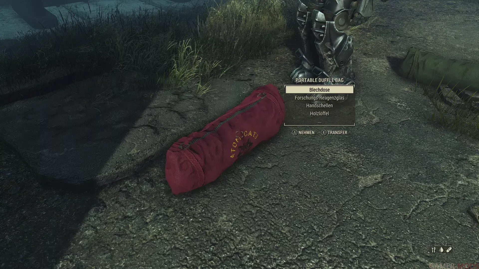 - 2. Позволяет поднимать размещенные вещмешки (присев около них и активировав), переносить их в инвентаре (вес всегда минимальный) или прикреплять к силовой броне для хранения тяжелых предметов, таких как оружие или портативный лагерь из других модов;