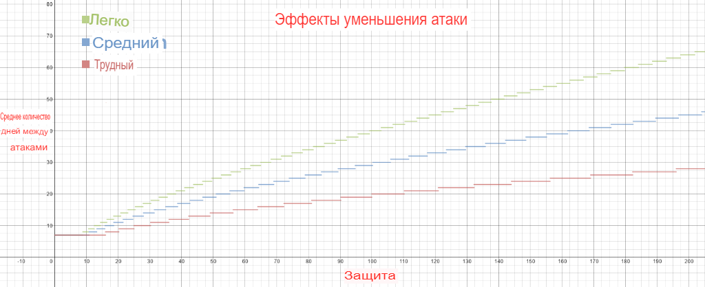 Чтобы смягчить эту проблему, автор придумал систему для уменьшения этой частоты, чтобы хорошо защищенное поселение не подвергалось нападениям каждую неделю, следуя этой кривой.