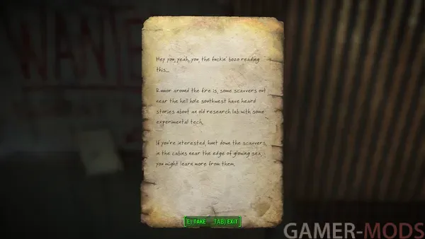Странная записка, прибитая к доске объявлений в Даймонд-сити, гласит: мусорщики нашли старый военный бункер, уничтоженный апокалипсисом. Внутри скрыто забытое экспериментальное оборудование, но путь туда преграждает кошмарный уровень радиации.