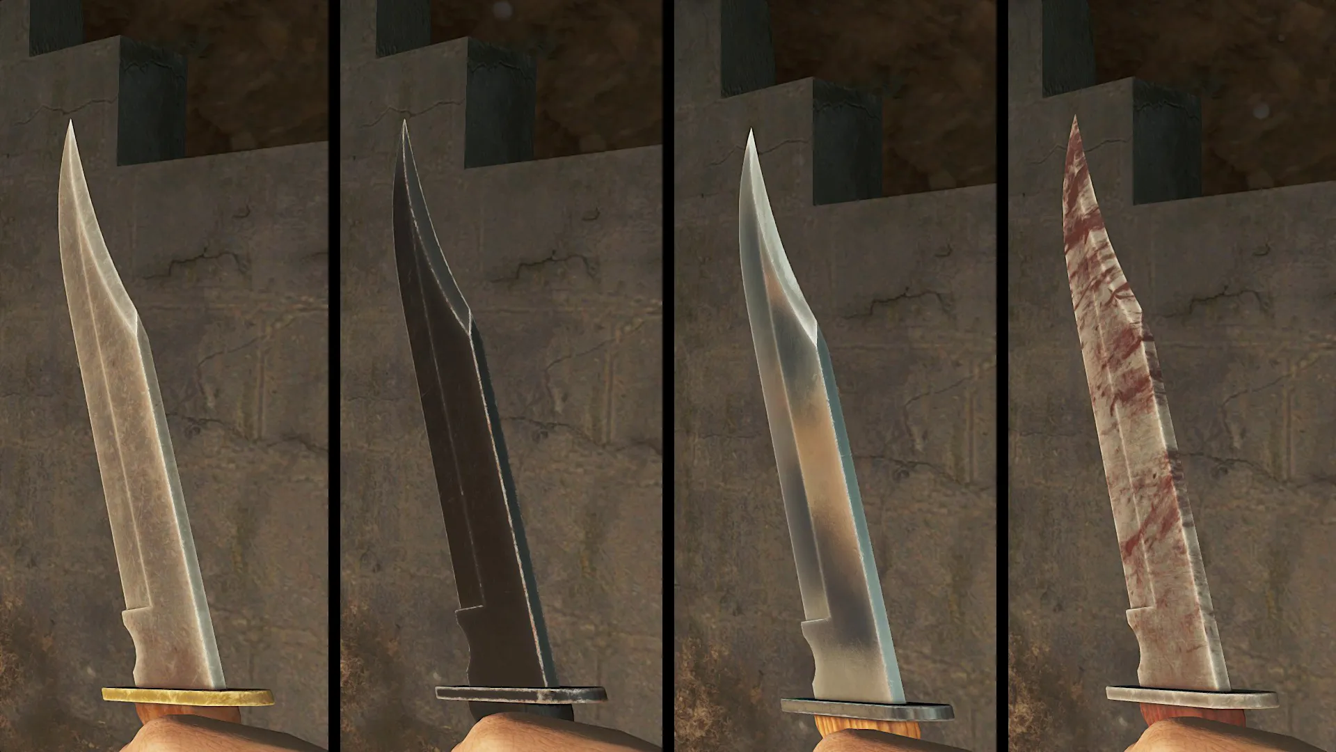 - Кастомизация: Имеет три основные модификации для увеличения урона и три цветовых варианта, которые дают бонусы к характеристикам (например, увеличение урона от скрытых атак или критических ударов). (прим. В игре модификации для ножа будут начинаться как Нож Боуи, а само оружие получает название из INNR согласно английскому названию Bowie Knife > Боуи Нож, править INNR я не стал.)