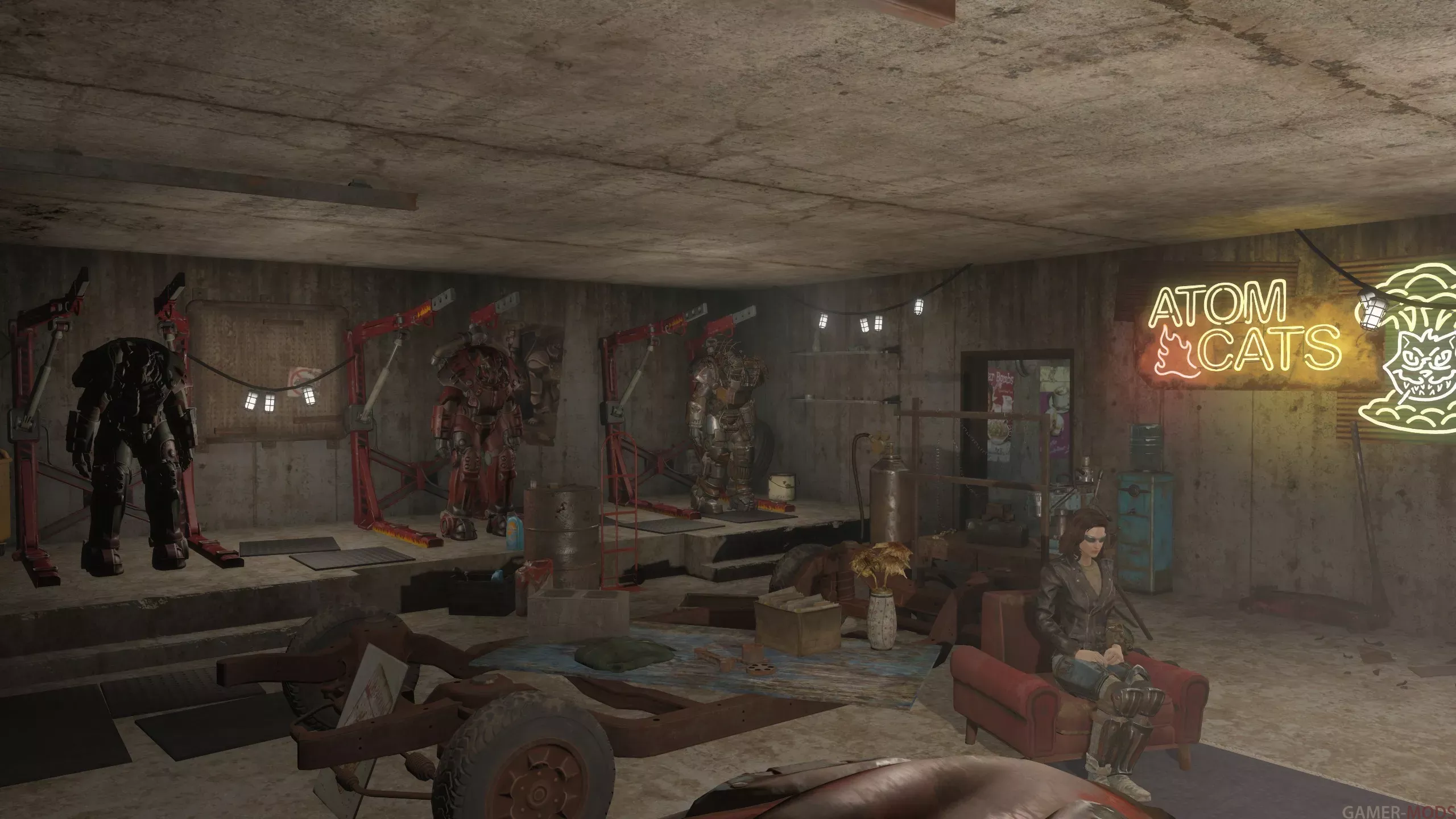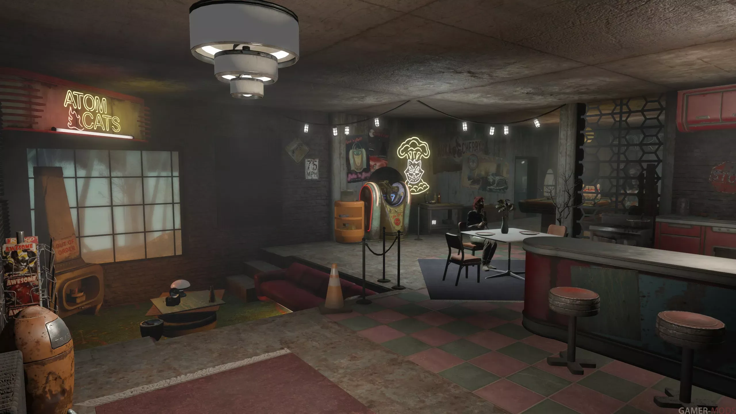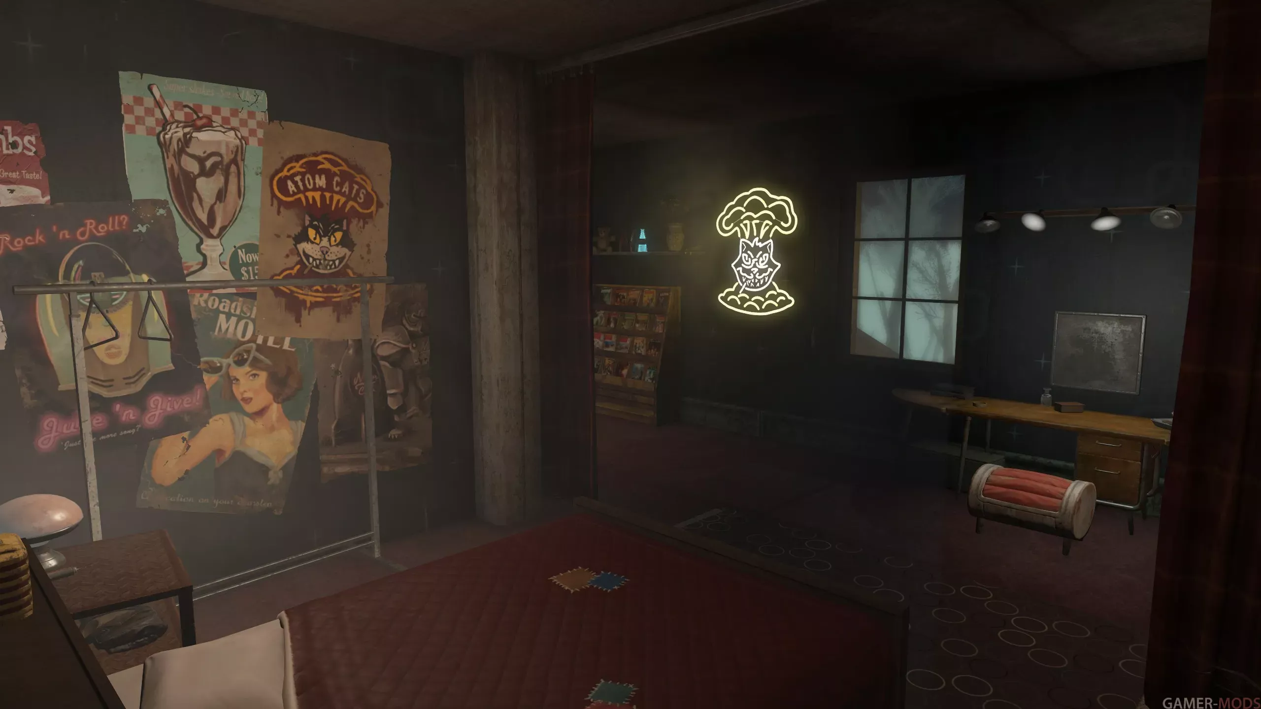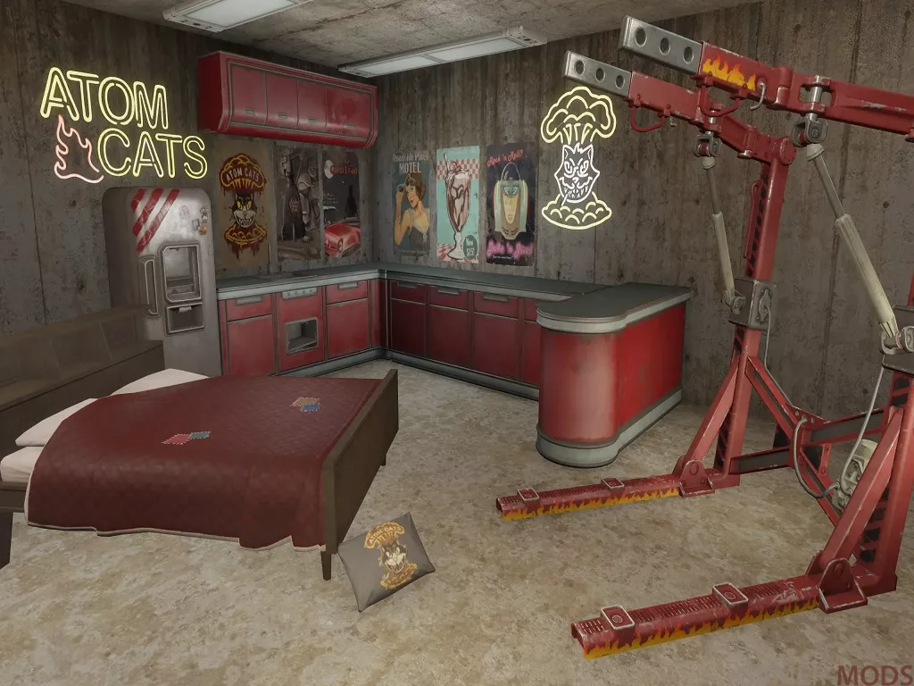 Городская площадка Атомных Котов включает в себя верстаки для доспехов, оружия, силовой брони и шемов, а также плиту для приготовления пищи. Он также поставляется с некоторыми новыми конструктивными элементами: 2 неоновые вывески на тему Атомных Котов 6 плакатов Подушка на тему Атомных Котов Перекрашенная силовая бронетанковая станция Перекрашенный кухонный гарнитур с холодильником Перекрашенная кровать