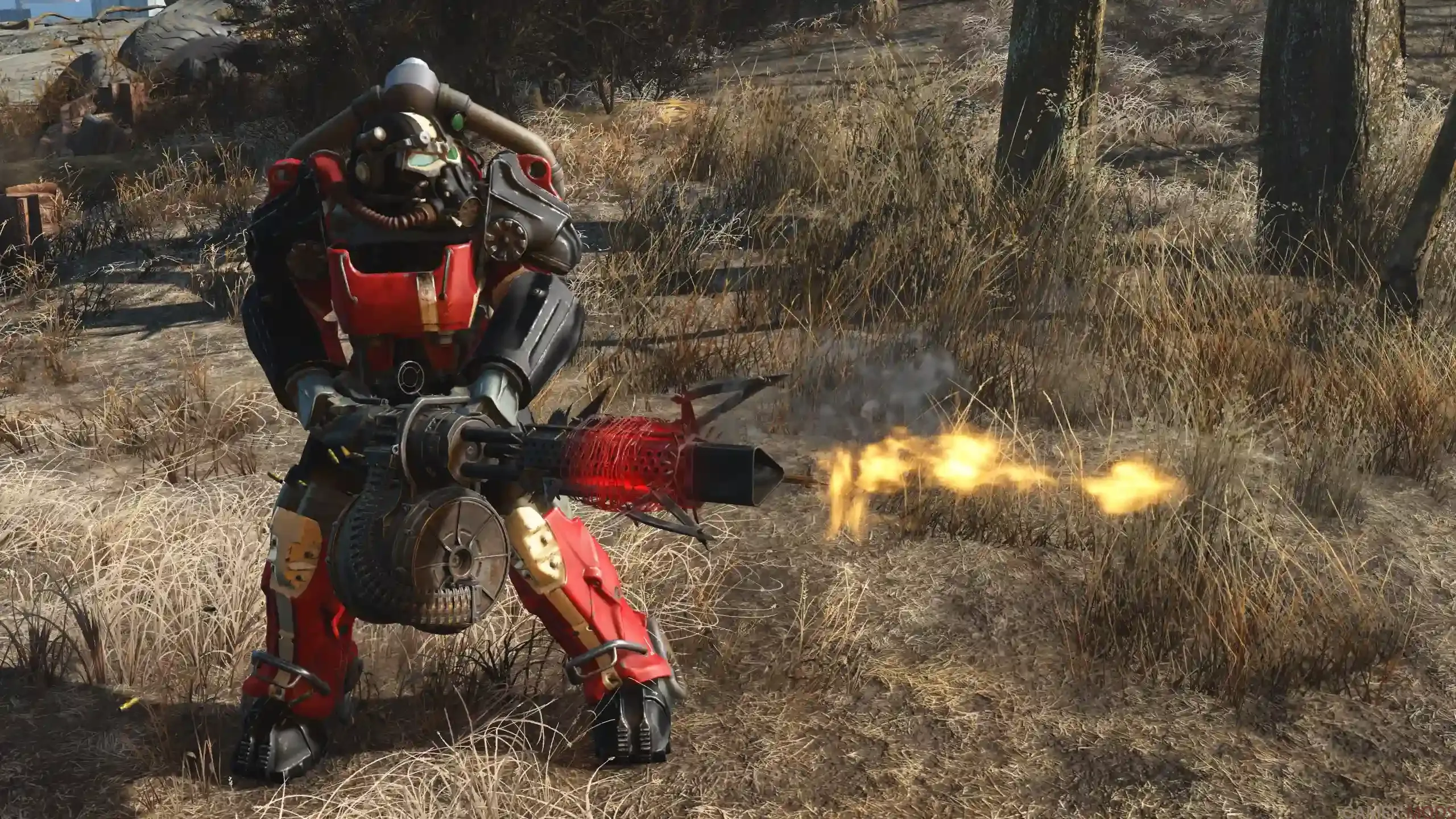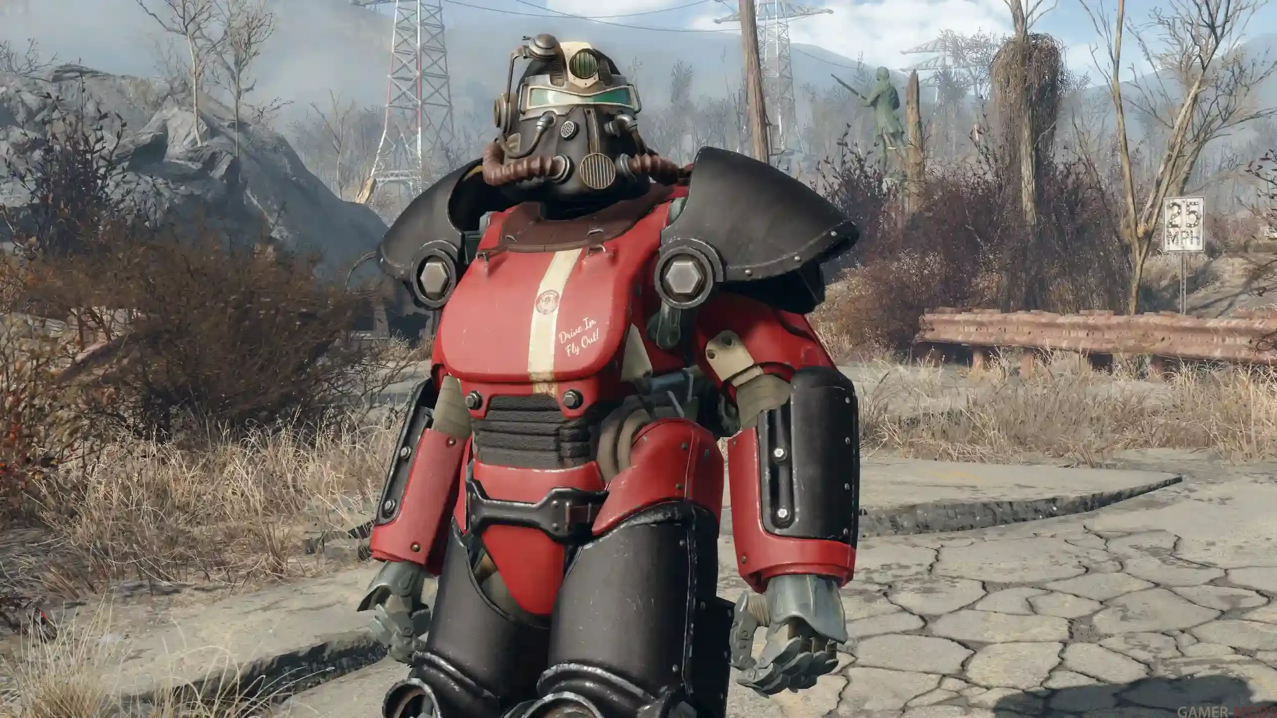 Всё готово! Эта красно-чёрная окраска «Красная ракета» доступна для всех стандартных типов силовой брони в игре.