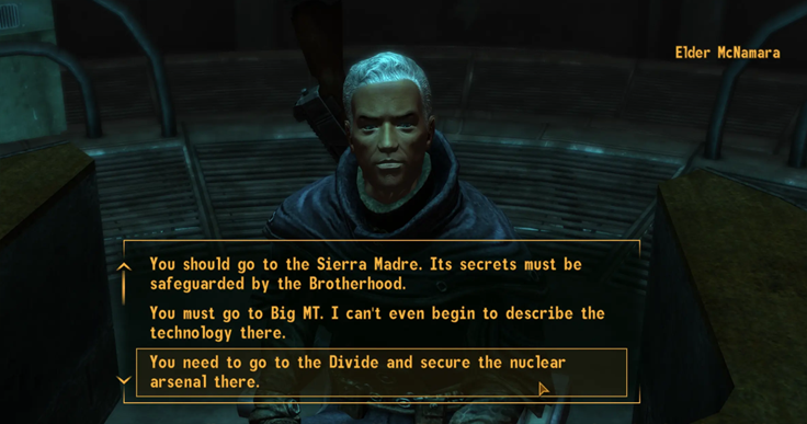 Чтобы варианты диалога были доступны, старейшина Макнамара должен оставаться старейшиной после снятия карантина, поскольку Хардин не похож на человека, который отступит. Чтобы убедить Макнамару вывести Орден из Мохаве, требуется высокая проверка навыка красноречия, если только вы ещё не стали членом Братства; в этом случае проверка красноречия не требуется. Этот вариант диалога будет недоступен, если вы уже заключили перемирие с Братством Стали и НКР.