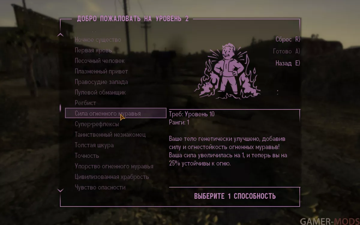Ваше тело генетически улучшено, добавив восприятие и огнестойкость огненных муравьёв! Ваше восприятие увеличилось на 1, и теперь вы на 25% устойчивы к огню.
