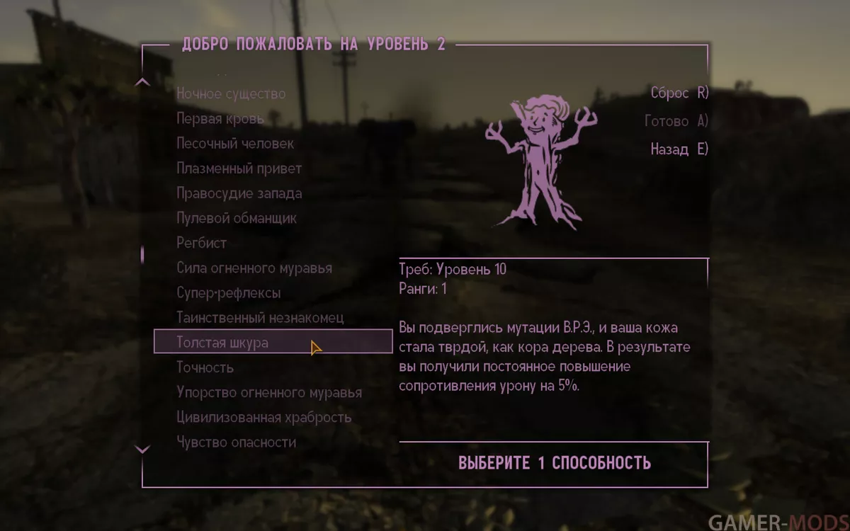 Вы подверглись мутации В.Р.Э., и ваша кожа стала твёрдой, как кора дерева. В результате вы получили постоянное повышение сопротивления урону на 5%.