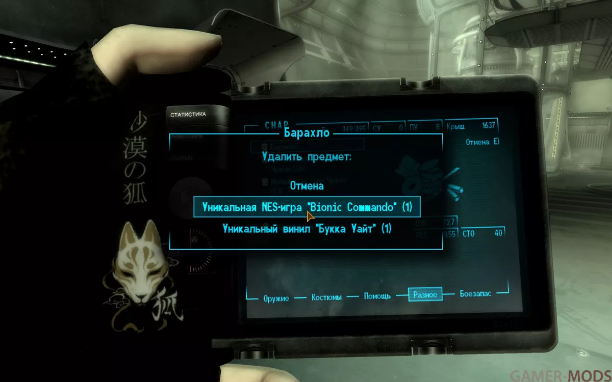 ◦ Раздел *Хлам* позволяет вам содержать свой инвентарь в чистоте, одновременно сокращая время, затрачиваемое на многократную продажу ненужных предметов торговцам. Это делается путем объединения предметов в единую запись "Хлам" на вашей вкладке "РАЗНОЕ" Пип-Боя.