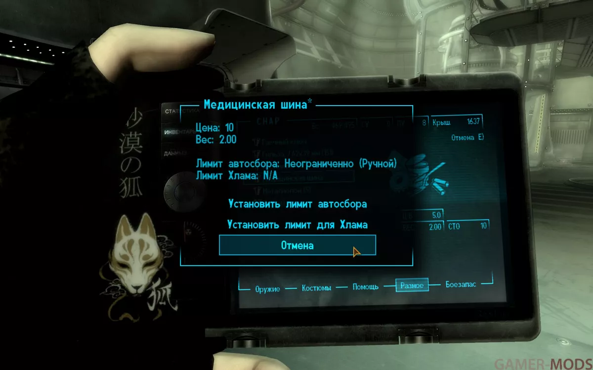 ◦ Установка лимита на 0 означает, что предмет всегда добавляется непосредственно в раздел «Хлам» (т. е. установите лимит 0 для Пачек сигарет, Довоенных денег и т.д.).