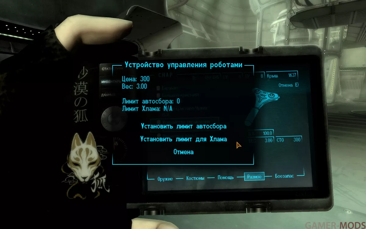 ◦ Что касается предметов помощи, разного снаряжения и боеприпасов, то в меню пометки есть возможность установить лимит на продажу ненужных предметов. Любые предметы в вашем инвентаре, превышающие этот лимит, автоматически добавляются в раздел «Хлам». При проверке этого лимита также учитываются предметы, которые несут ваши компаньоны и которые находятся в хранилище для крафта, но это можно отключить в INI-файле. Этот лимит проверяется каждый раз, когда вы подбираете предмет.Установка лимита на 0 означает, что предмет всегда добавляется непосредственно в раздел «Обмен хламом» (т. е. установите лимит на 0 для пачек сигарет, довоенных денег и т. д.).
