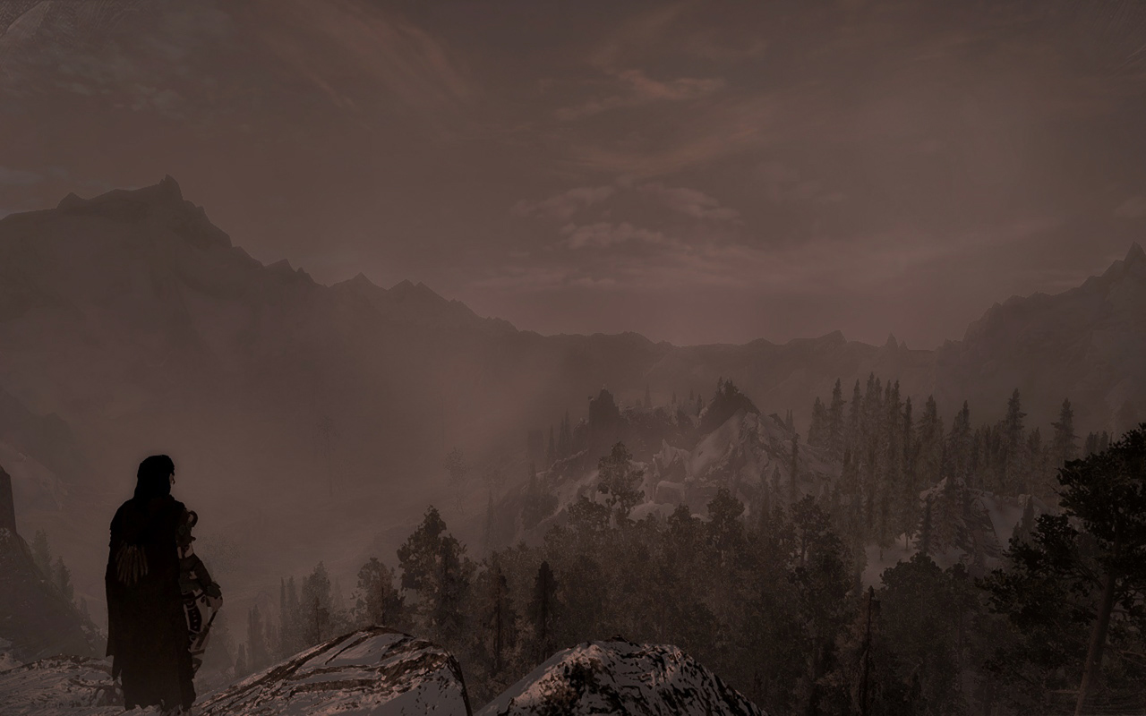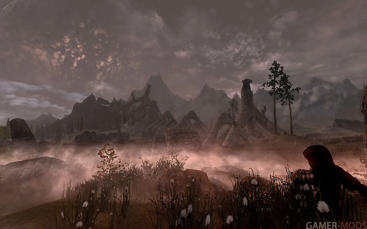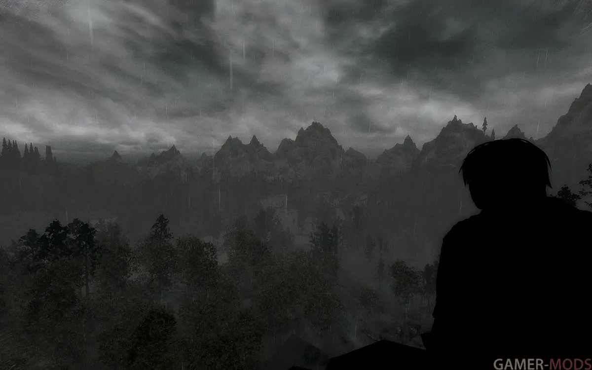В сборке холодно, туманно, метели, дожди, грозы - Это Скайрим... Примерное время прохождения процентов на 80% - от 200 до 500 часов, при вдумчивой игре.