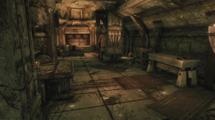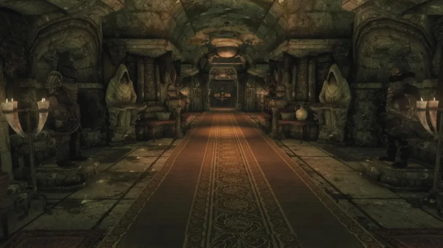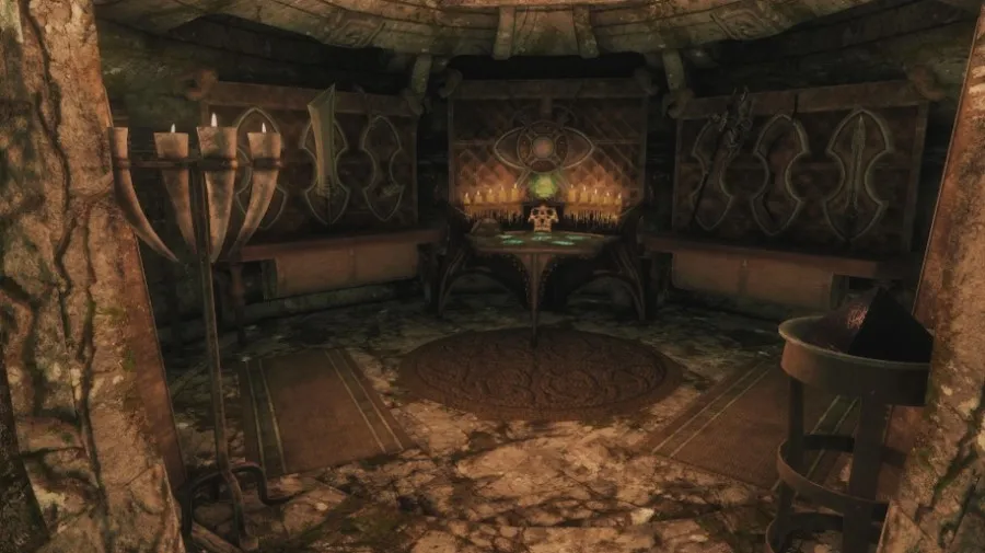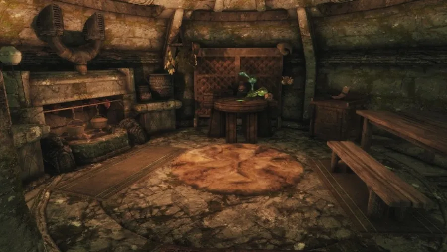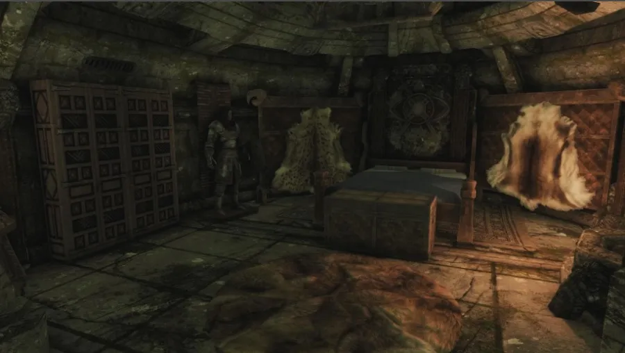 - Главный зал с 7 витринами для оружия, 2 креплениями для щитов, 8 бюстами для масок драконьих жрецов, 4 контейнерами для хранения, 4 манекенами и декоративными нордскими фресками на стенах.