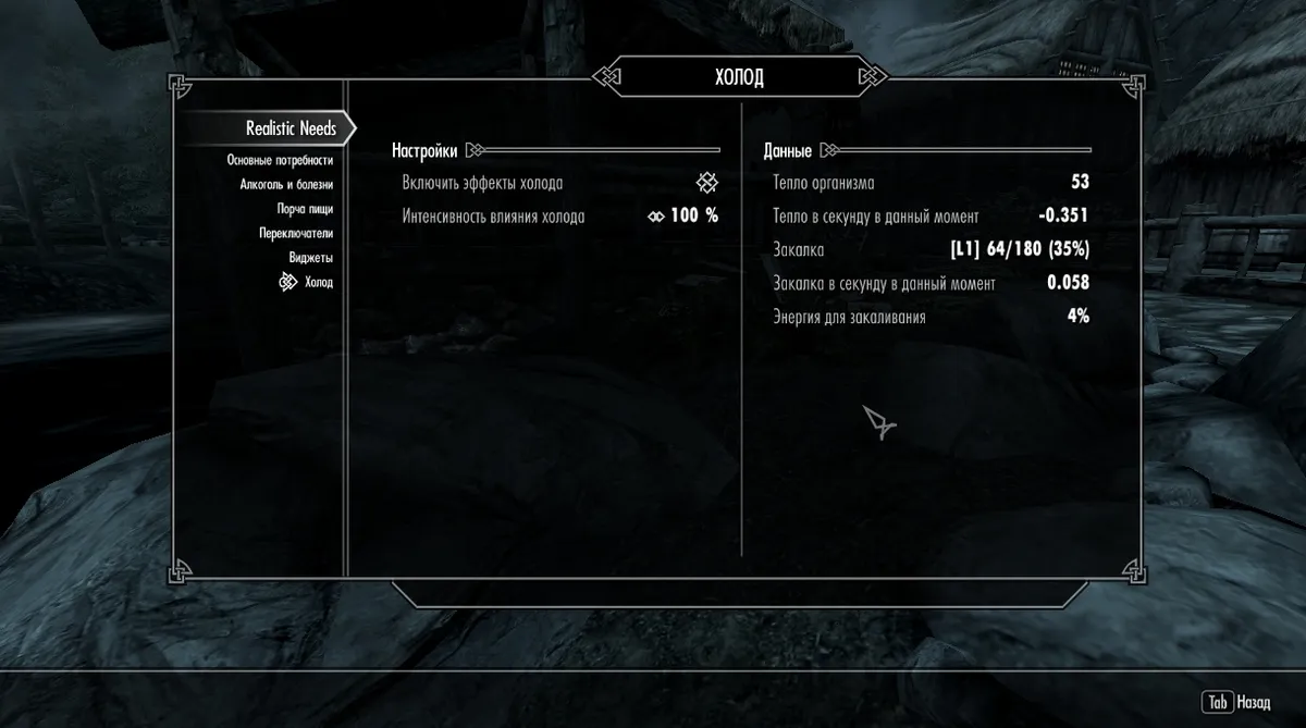 В этой модификации я переработал и дополнил многие аспекты популярного мода Realistic Needs and Diseases. Моя основная задача состояла в том, чтобы добавить вещи, которых на мой взгляд не хватало в оригинальном моде - такие как холод или разнообразие в еде, а так же сделать его совместимым с модами Requiem - как минимум RFAB 5.0, который установлен на моем LE. В конце дам ссылку на сборку Skyrim RFAB 5.0 Legendary Edition для 32-64bit, если кого-то заинтересует.