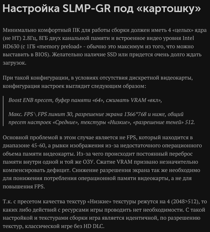 SLMP-GR (Simple Lore Mods Pack - Game Ready) - широко зарекомендовавшая себя сборка, во многом задавшая стандарт качества. Сборка итог более чем 8-ми летней кропотливой работы, направленной в первую очередь не только на визуальную составляющею, но на технический аспект работы игры, качество ресурсов.