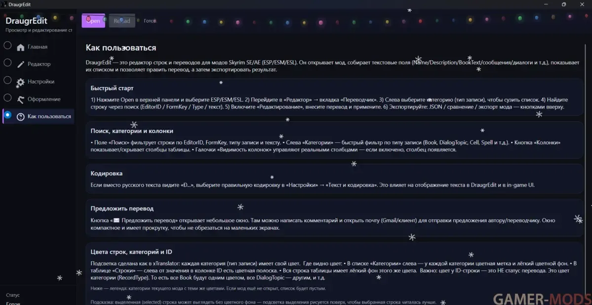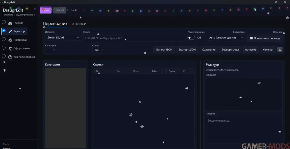 Он открывает выбранный мод, извлекает все поля, где встречается текст, и показывает их в удобном списке (с фильтрами и поиском). Дальше ты можешь редактировать строку (перевод/вариант текста) и видеть результат в игре, не закрывая Skyrim.