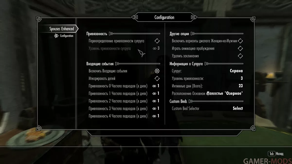 Расширяет супружеские отношения с вашей второй половиной/половином). Позволяет вам целоваться, назначать супругу гардероб. В супружеские отношения вводятся такое понятие как "привязанность", чем она выше тем более сексуально раскрепощенным становится ваш супруг (открываются новые позы для секса) и др. возможности. Включена поддержка Hearthfire, теперь если в доме дети секса вам не перепадет.