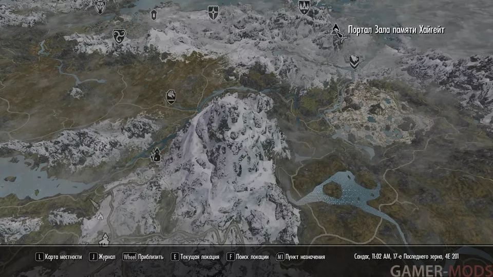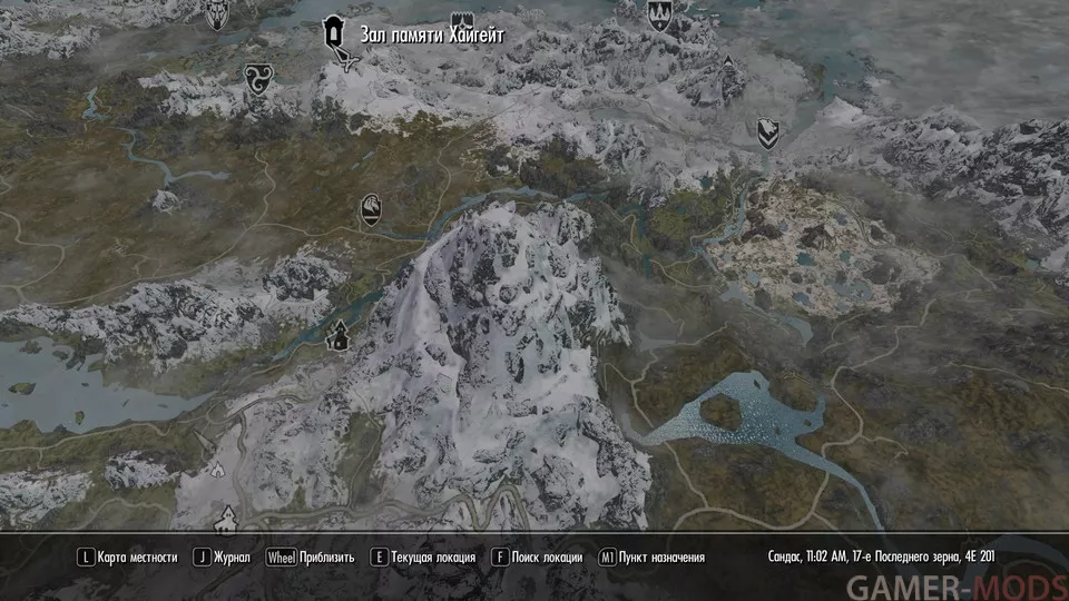 Вход в Зал памяти расположен возле нордских руин Высоких Врат, расположенных в окрестностях Морфала. В самом зале имеется портал, выводящий к дороге между Виндхельмом и Винтерхолдом, возле пещеры Мертворожденного. В результате в пешей доступности для Довакина окажется 5 городов северной части Скайрима - Солитьюд, Морфал, Данстар, Виндхельм и Винтерхолд. Маркеры расположения главного входа и портала (порталов, если подключена портальная комната) появятся на игровой карте Скайрима сразу по подключении мода.