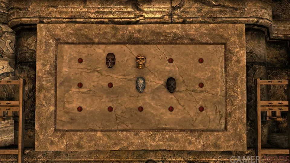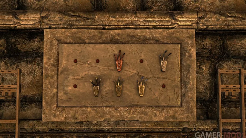 Все двери и порталы заперты. Они открываются ключом, но входные из Скайрима можно взломать (уровень Эксперта). В коридоре за входной дверью есть три сундука, чтобы сбросить лут до похода за ключом если вошли вы взломом. В портальной комнате лут можно сбросить в двемерские комоды - их там два.