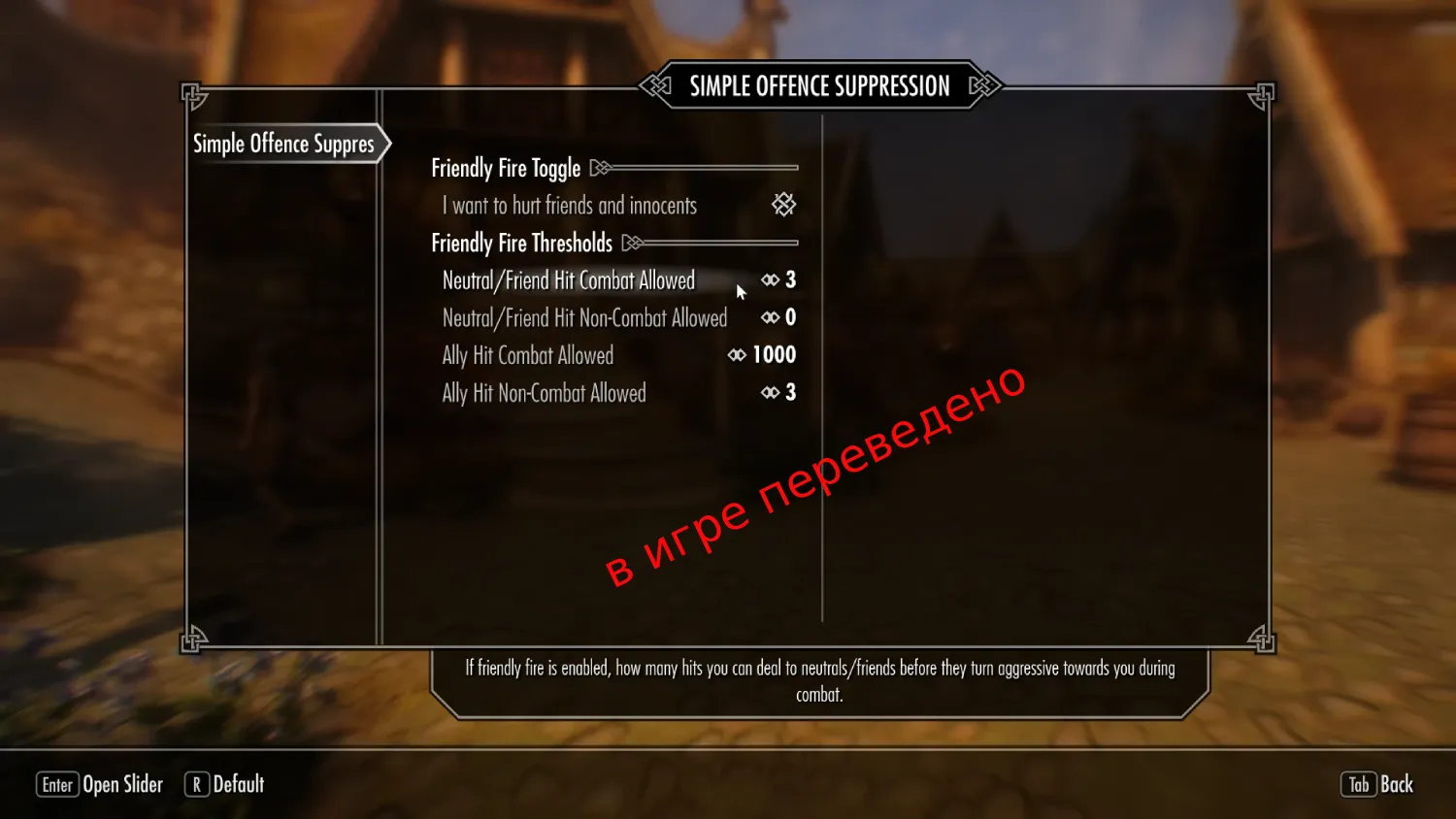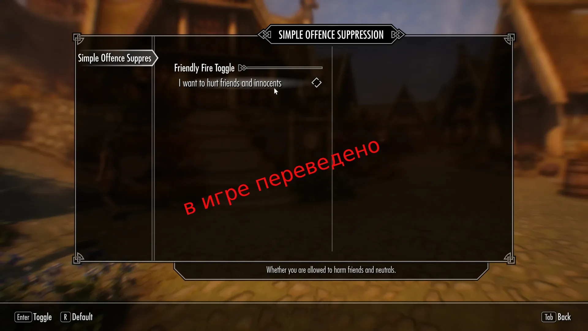 Модификация для блокировки атак по своим, можно включить/выключить в меню MCM, если вы решите снова убивать невинных людей. Требуется Simple Offence Suppression.