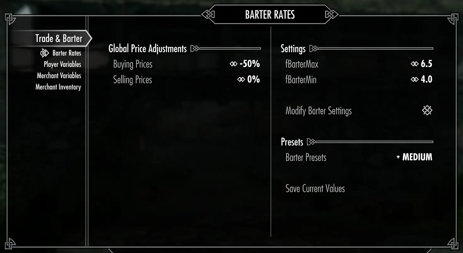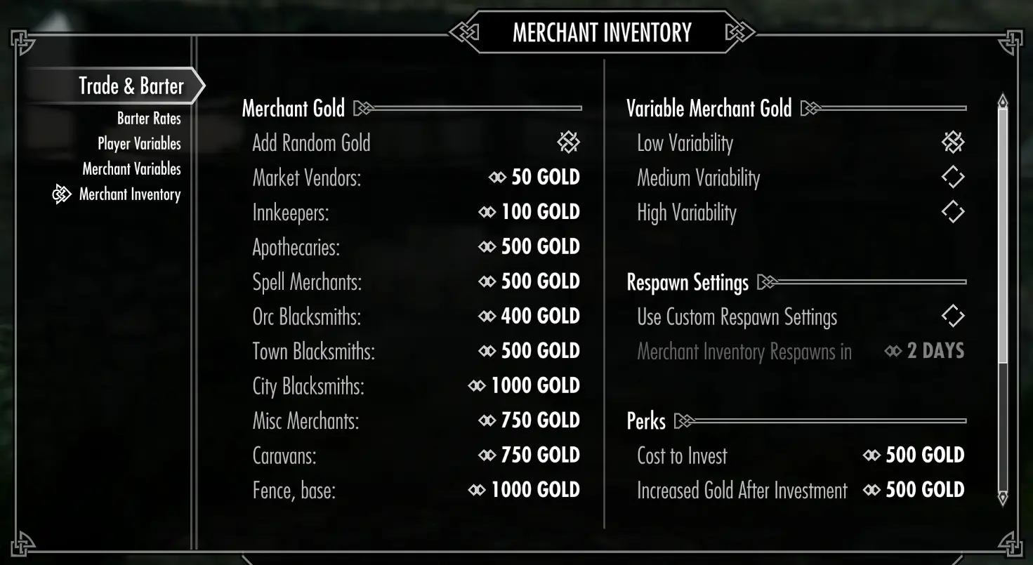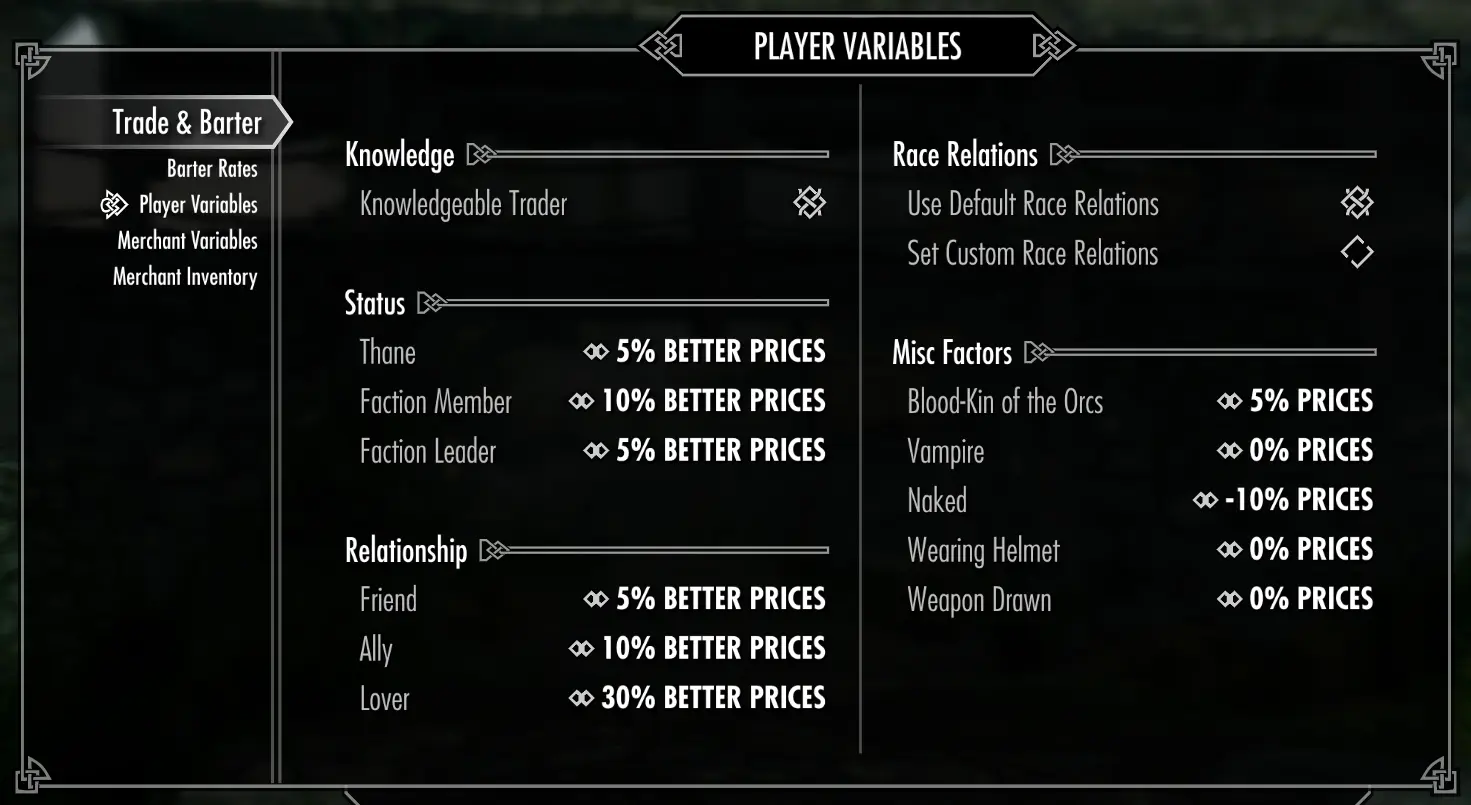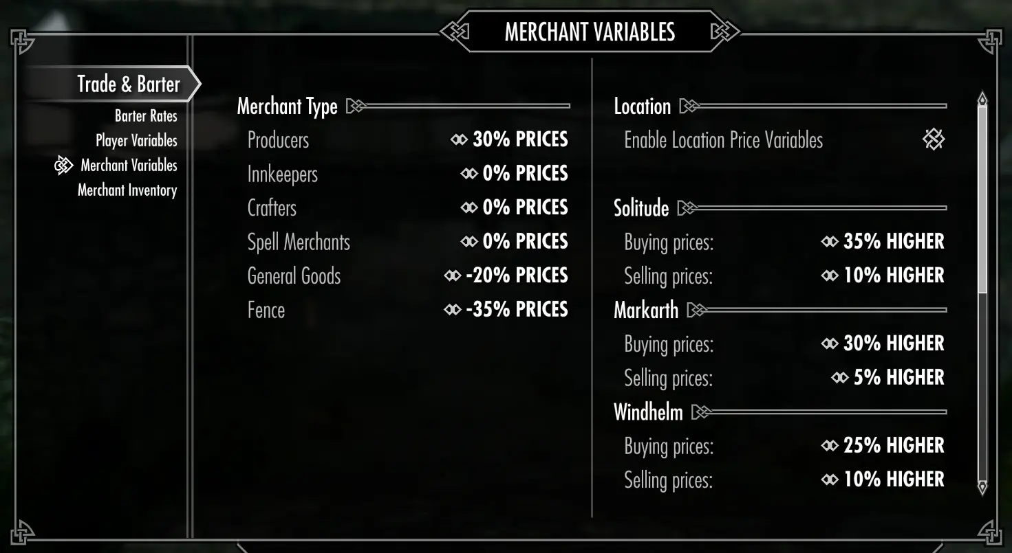 В оригинальной игре на процесс торговли практически ничего не влияет, кроме красноречия, и большинство игроков не прокачивают этот навык, считая его бесполезным. Этот мод изменит ваше представление о его значимости и добавит множество новых факторов. Вас никогда не смущало, что у захудалого сельского кузнеца денег столько же, сколько у его коллеги из столицы? Разве не обидно, когда вы глава Гильдии воров, а Тонилла всё так же платит гроши за украденный вами серебряный подсвечник? Вы можете торговать хоть голышом, и никто не обратит на это внимания? Вы архимаг, а заклинания по-прежнему баснословно дороги? Вы Брат Бури, но кузнец в Солитьюде спокойно продаёт вам оружие по обычным ценам? Вы тан всех городов, но жителям на это плевать? И даже ваша вторая половинка пытается на вас нажиться? Теперь всё изменится.