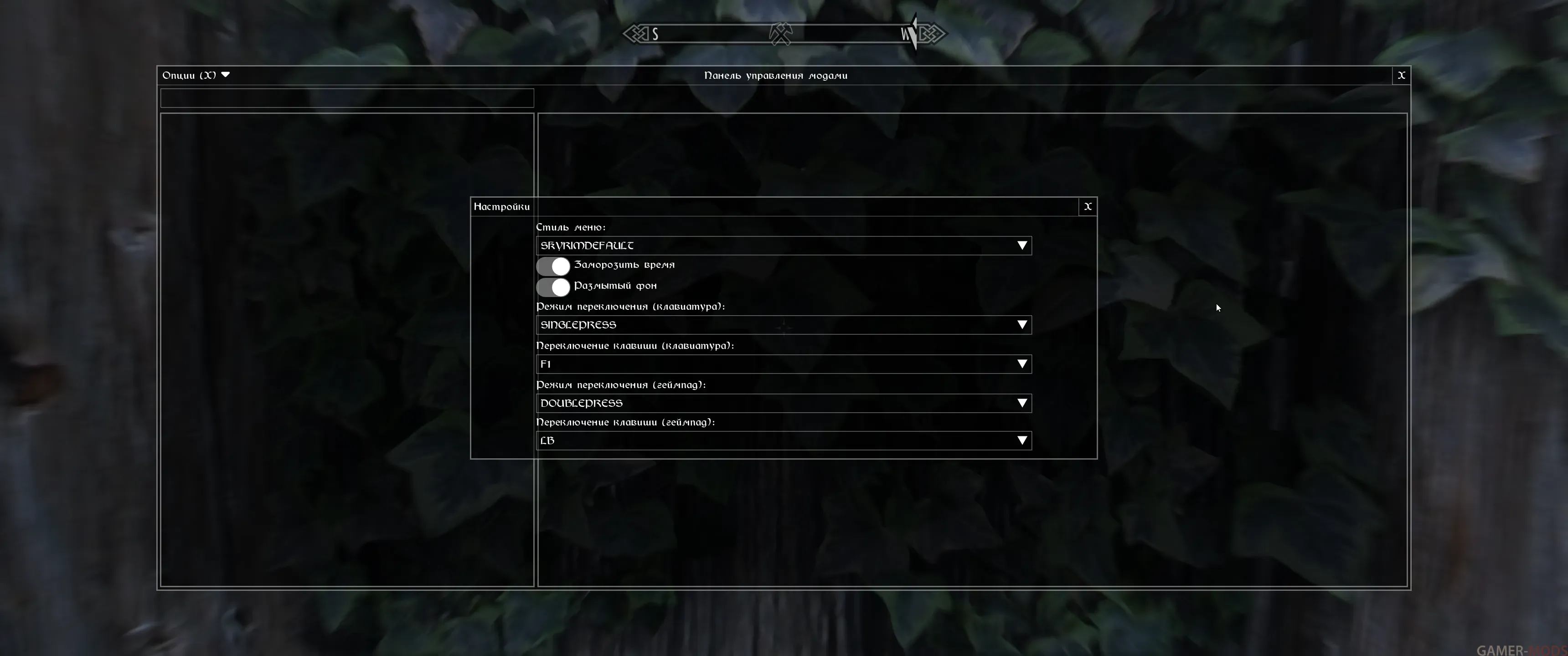 Все остальные настройки что есть в файле SKSEMenuFramework.ini, можно изменять в самой игре в окне "Панель управления модами", которое вызывается по умолчанию клавишей F1 (можете ее там же сменить на другую).