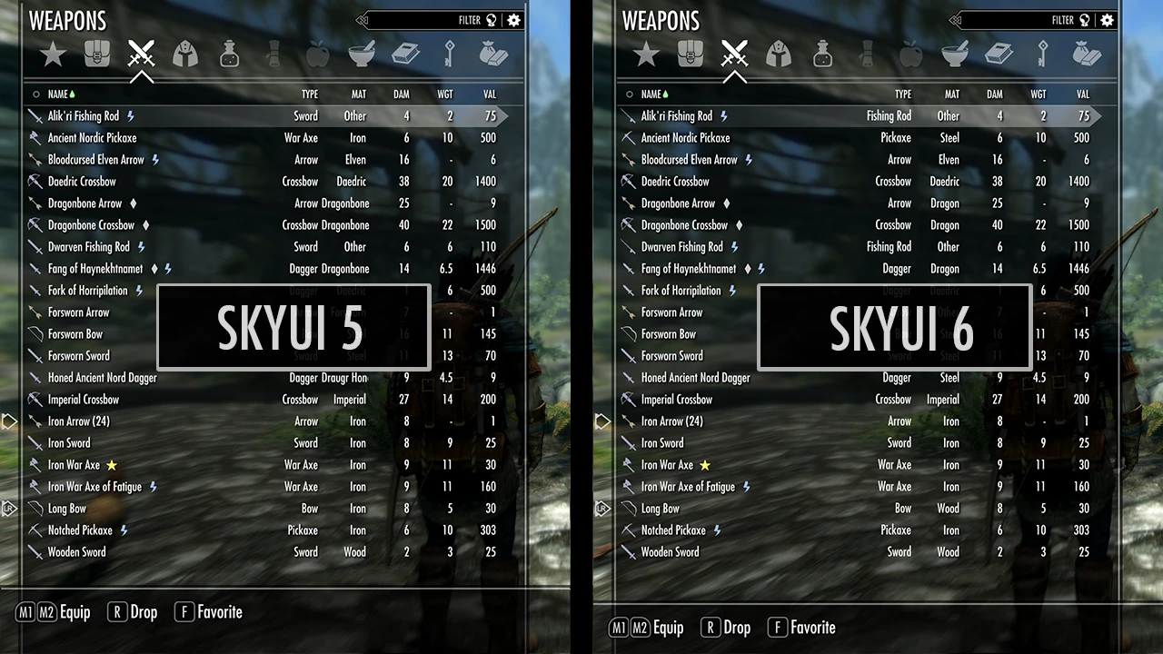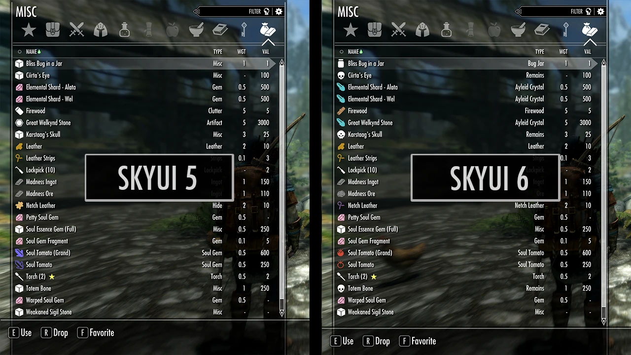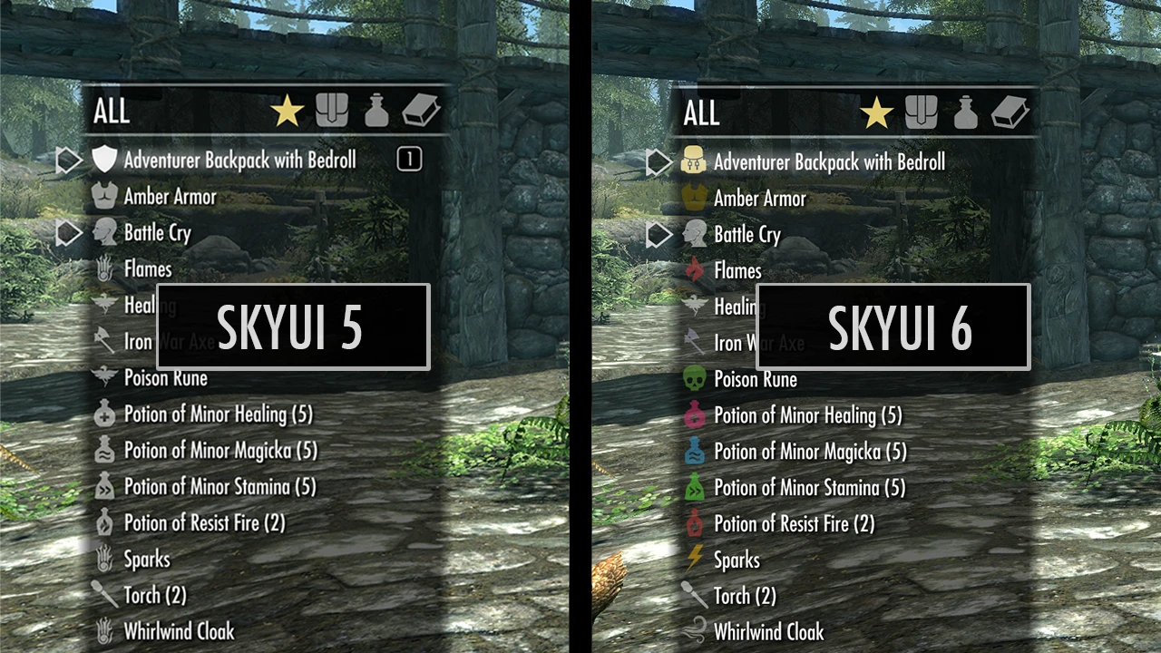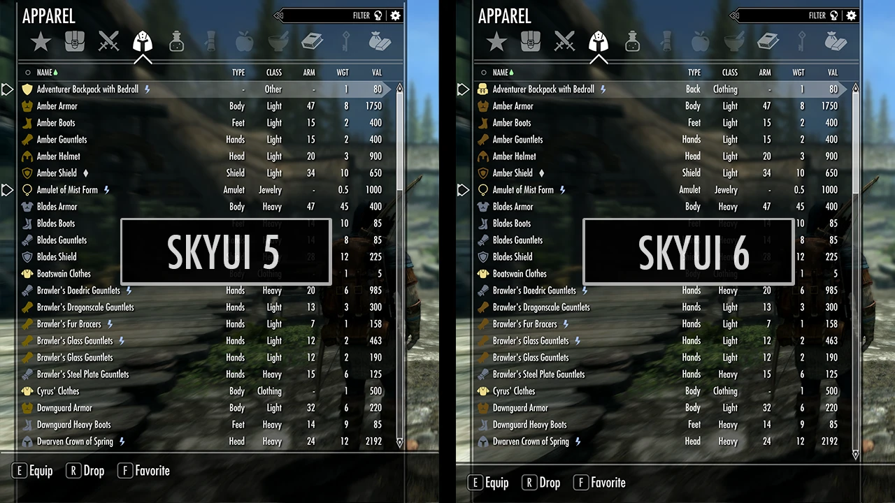 * SkyUI 6 в настоящее время включает в себя все исправления от сообщества с Nexus Mods, а также собственные исправления и дополнения.