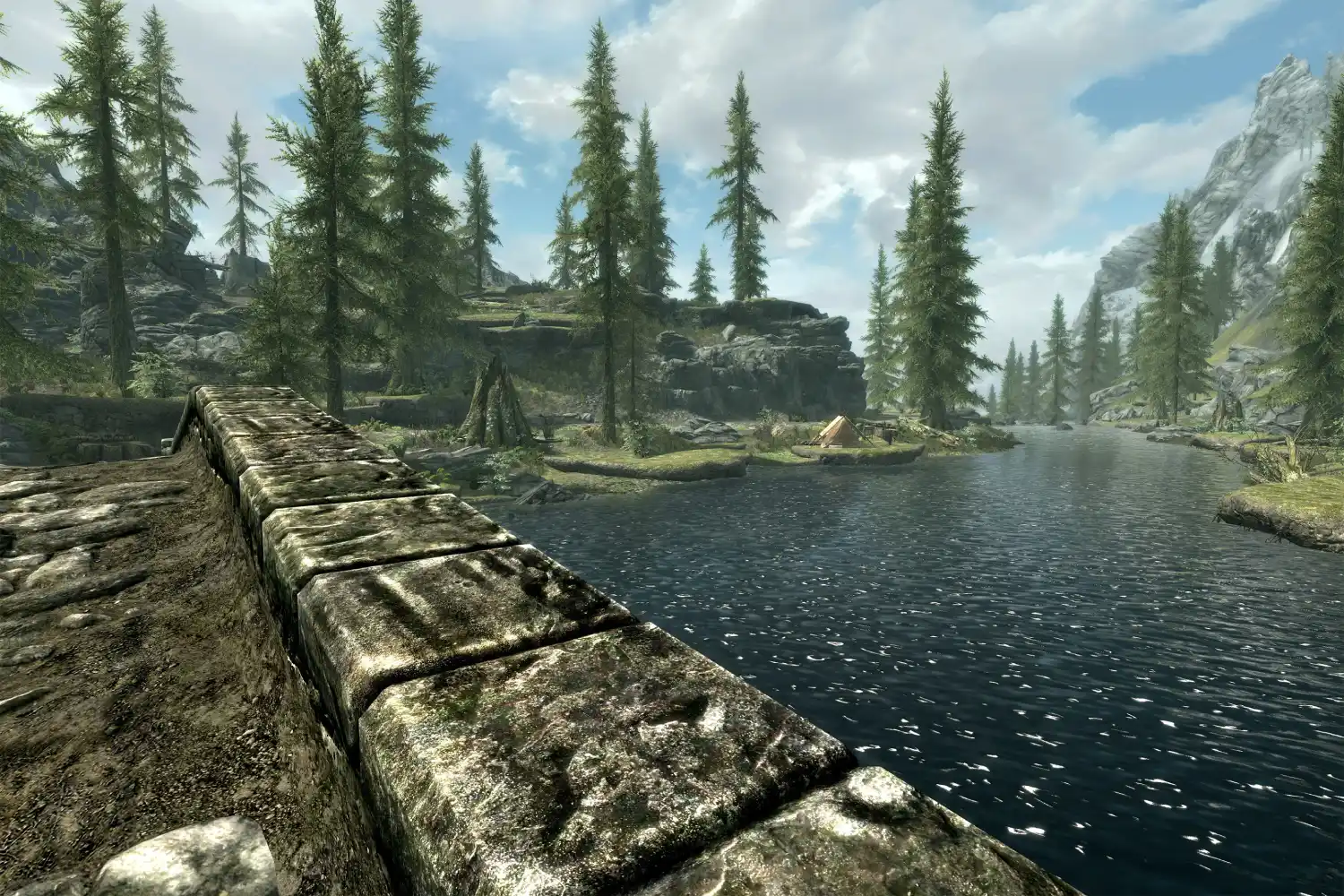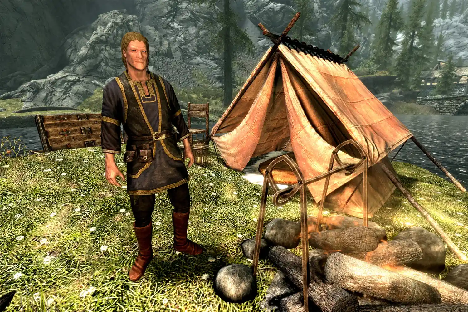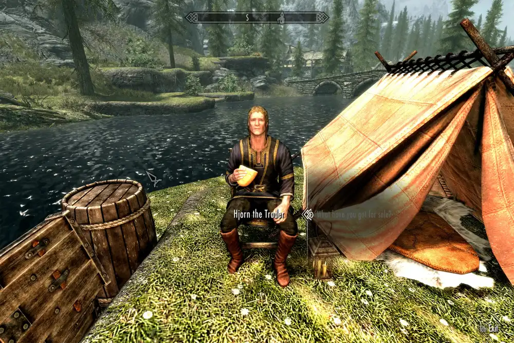 Познакомьтесь с Хьорном, придорожным торговцем, который с интересом знаком с историей, разбившим лагерь у моста за пределами Ривервуда. У него есть всё необходимое для путника по пути в Вайтран: еда, дрова, зелья и даже несколько любопытных находок.