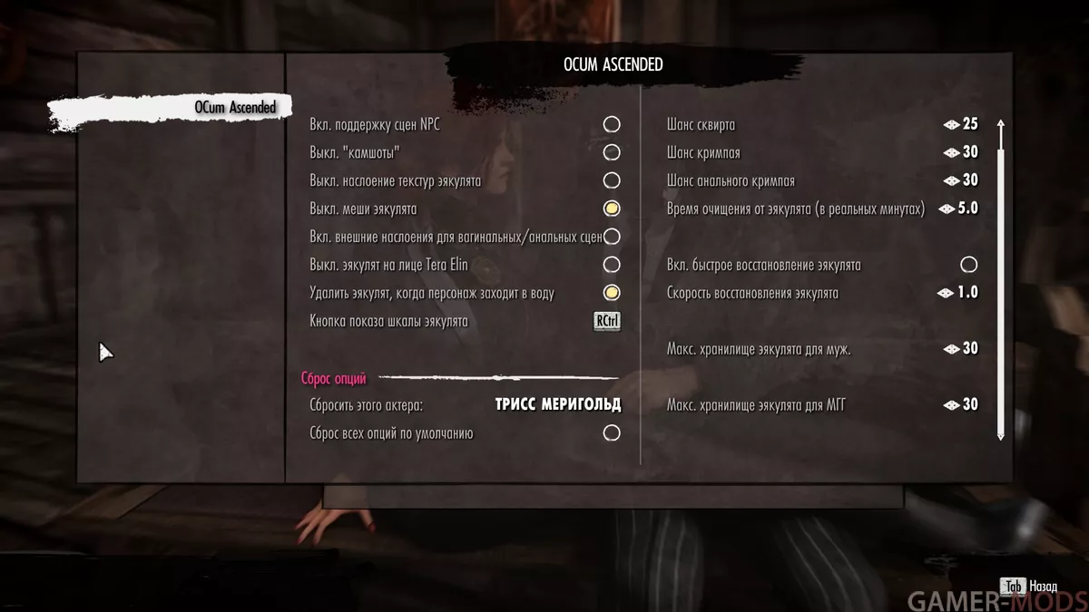 16. Шанс сквирта теперь полностью настраивается в MCM (в оригинальном OCum он был запрограммирован на 25%).