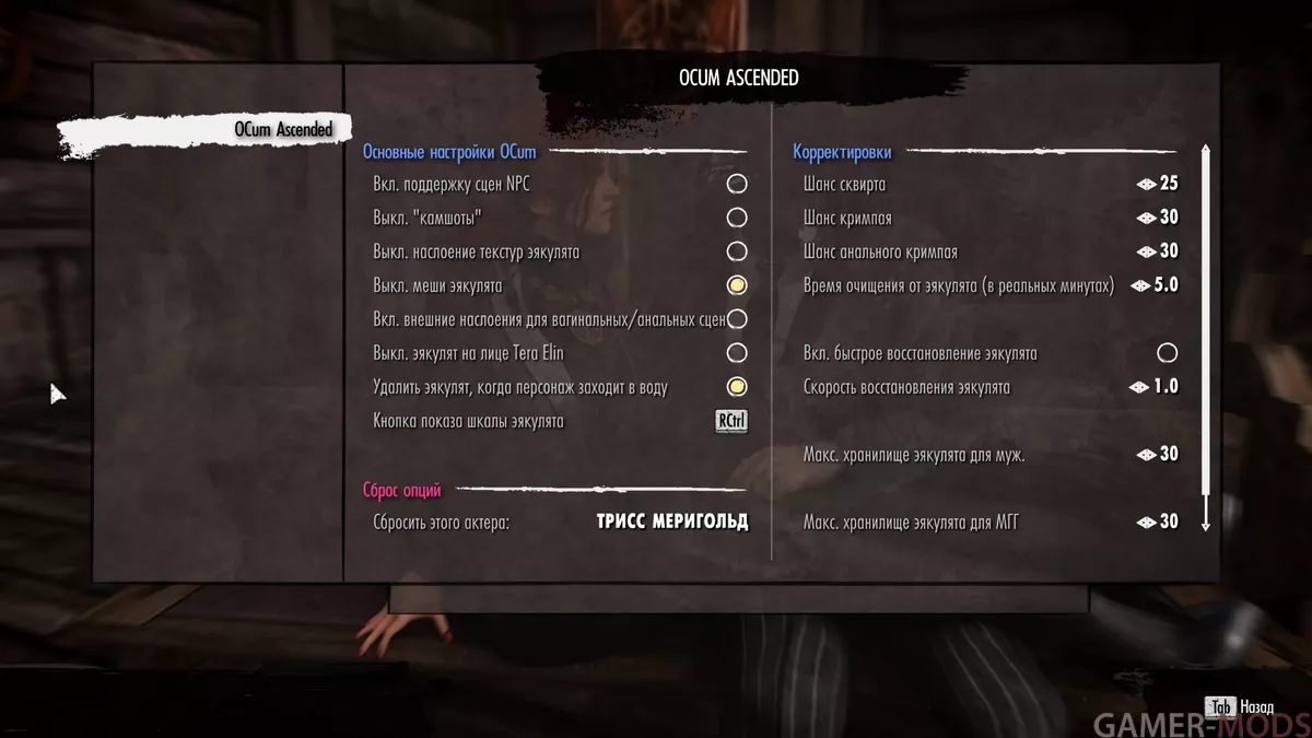 5. OCum Ascended теперь имеет собственное отдельное меню MCM с новыми и дополнительными параметрами. НЕ используйте параметры OCum MCM на вкладке дополнений OStim MCM. Они не будут работать! Настоятельно рекомендуется также использовать OCum Ascended — Cum and Orgasm Mechanics для OStim - загрузчик настроек от MaskedRPGFan.