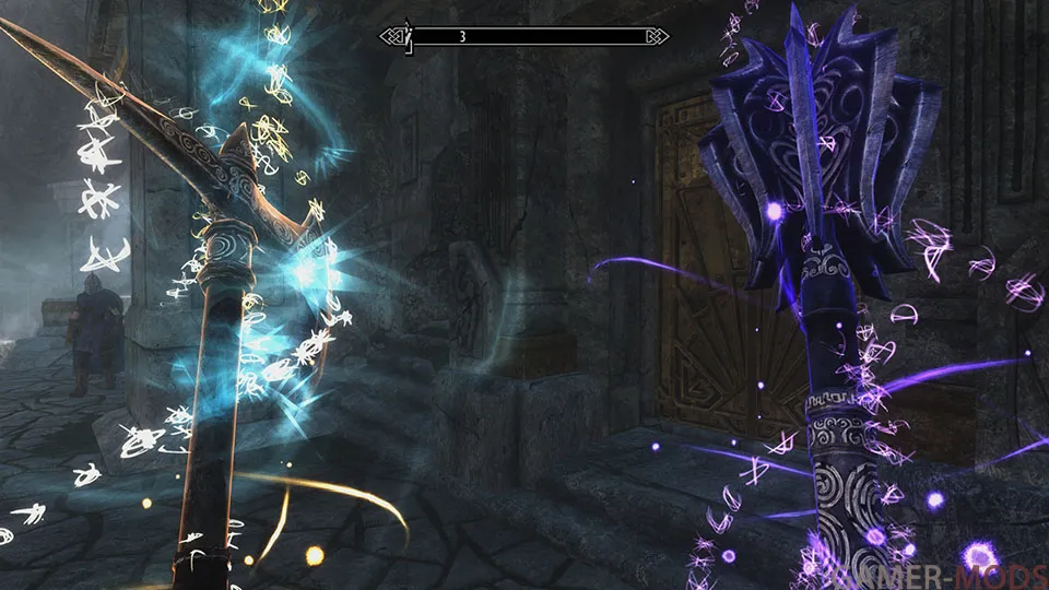 Всемогущий Удар - мощный заряд магической энергии, наносящий 400 урона здоровью, Магии и Выносливости. (3 Волшебных Рунных камня для одного зачарования.)