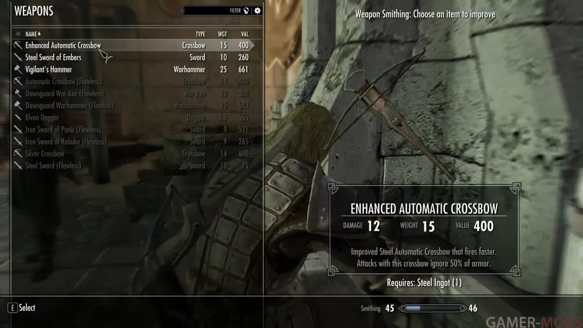 Добавляет автоматические стальные арбалеты и двемерские арбалеты гномов из дополнения Dawnguard.