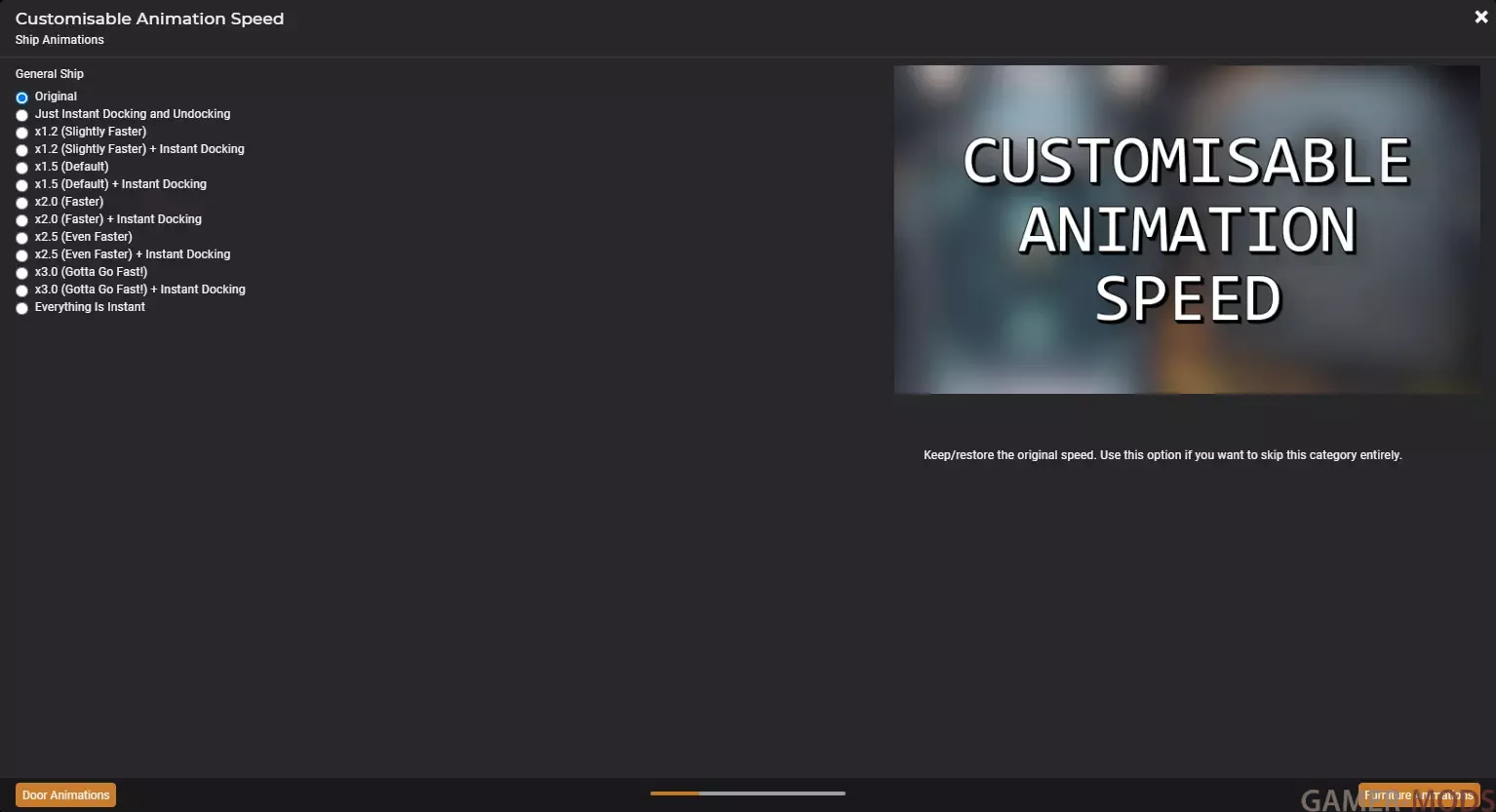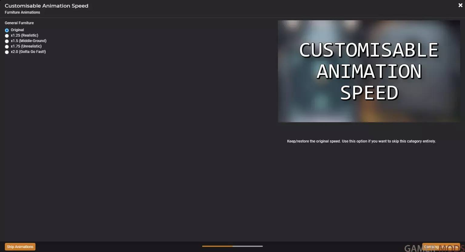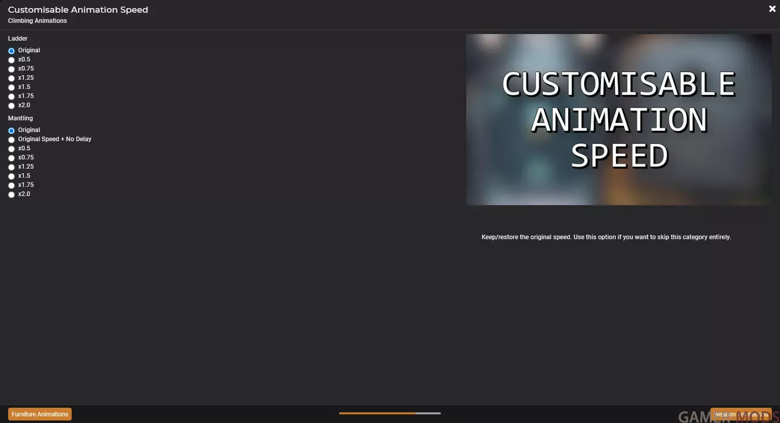 Из-за особенностей встроенного глобального графика анимации для мебели мод повлияет на все анимации мебели в одинаковом процентном отношении. Он также влияет на анимации NPC. Именно поэтому нет множителей больше х2 — они выглядели бы крайне нелепо и могли бы нарушить взаимодействие с некоторыми NPC.