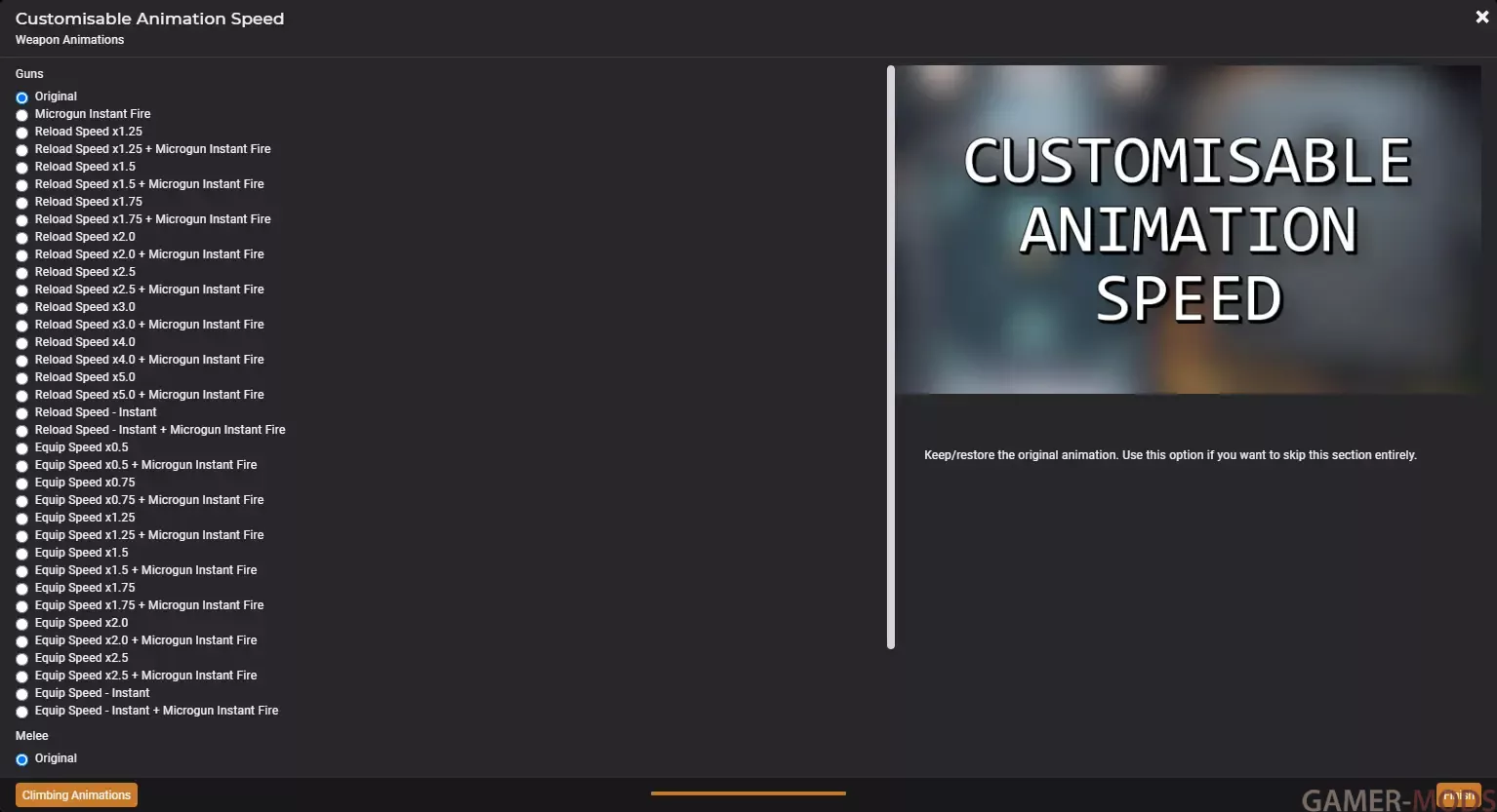 Нет, это невозможно. Этот мод ускоряет анимацию экипировки и перезарядки для всего оружия в одинаковом процентном отношении.
