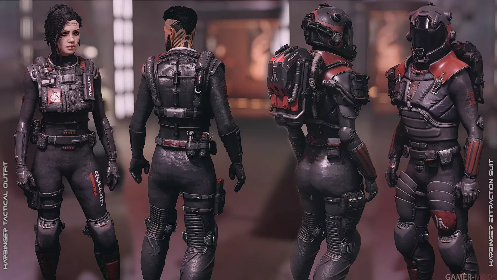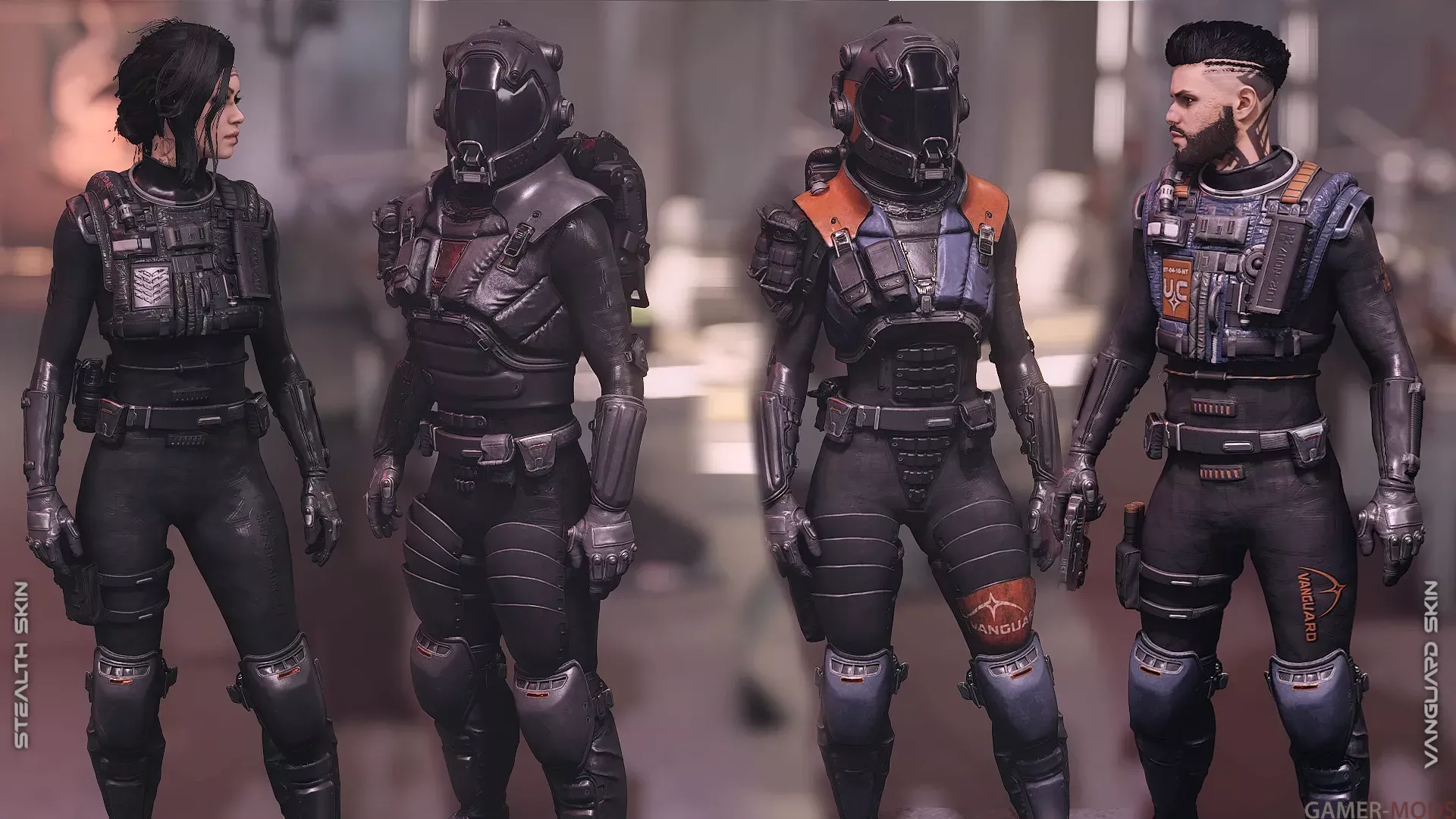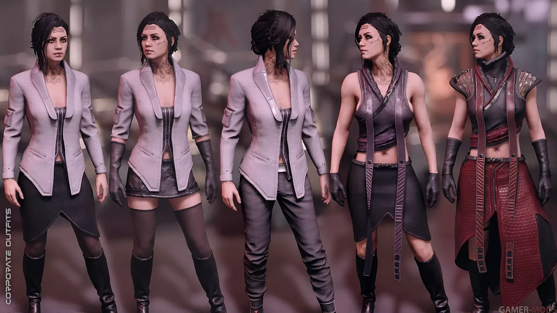 Костюмы «Корпо» предназначены для женских персонажей, мужская модель — заглушка. Для этих костюмов доступны ванильные скины, которые можно создать.