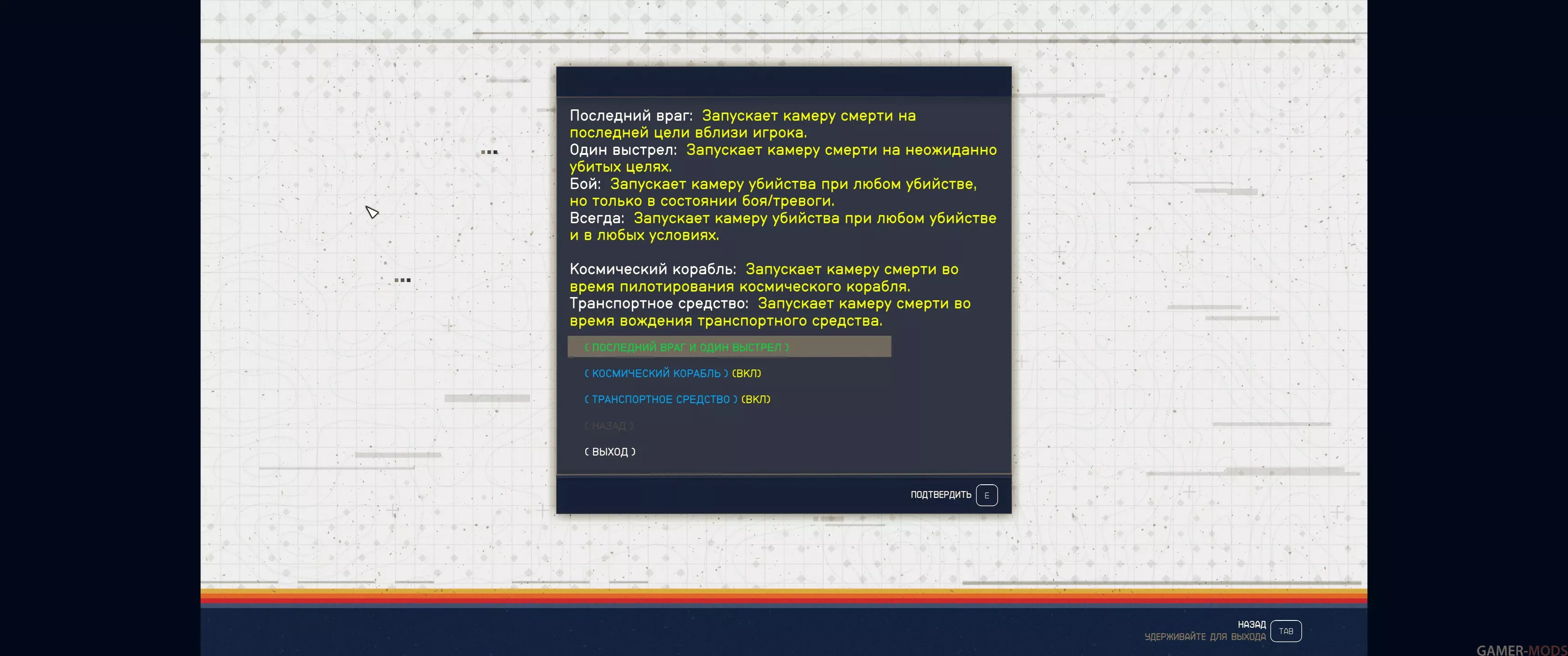 Настройки камеры >>> различные настройки камеры, такие как приближение, отдаление, поле зрения, расстояние срабатывания камеры убийства.