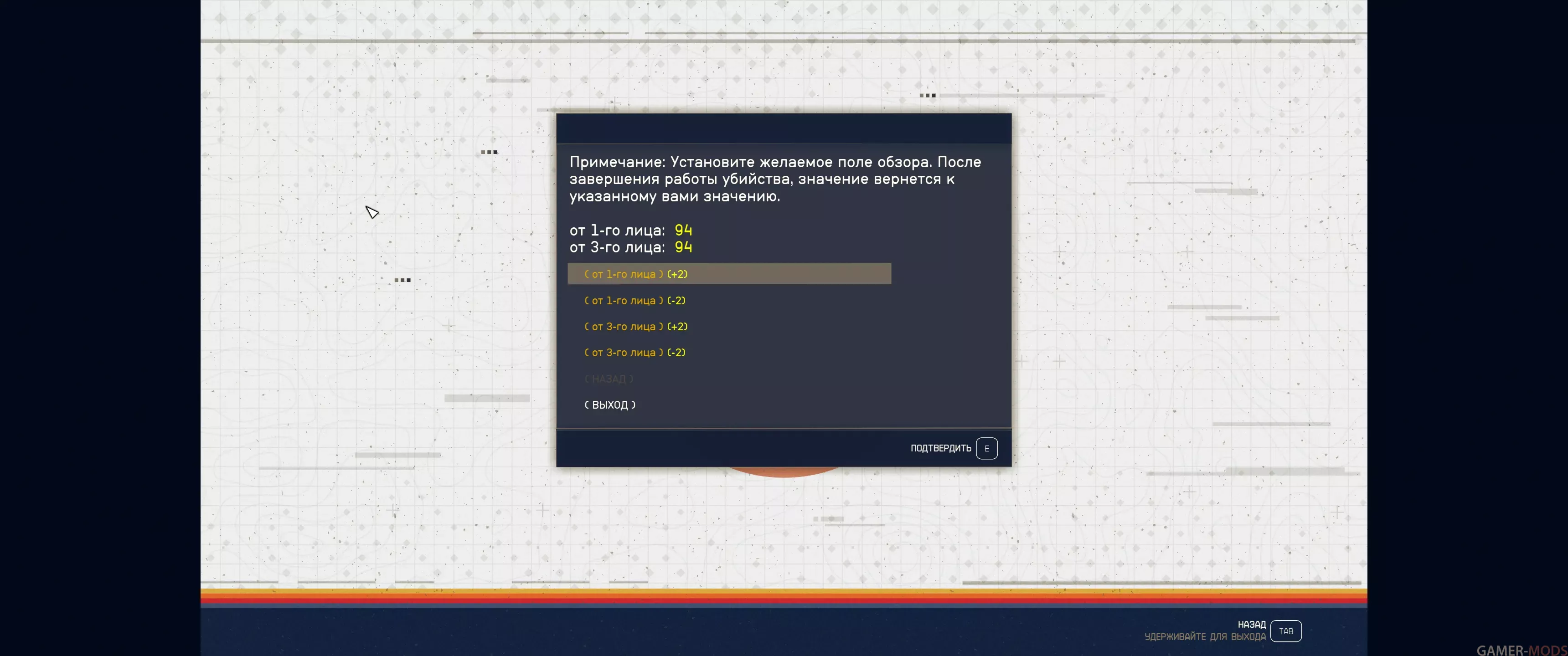 По умолчанию мод использует угол обзора 94 для обоих видов.