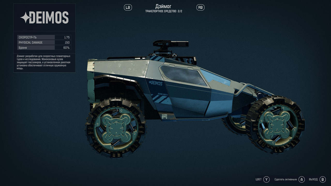 Так же как и REV-8 вы можете раскрасить Деймог в уникальные цвета. Путешествуя по планетам в Starfield, вы обязательно столкнетесь с враждебными элементами. Деймог оснащен более мощной навесной башней, а также броней для дополнительной защиты при движении. Ваши ускорители могут помочь вам быстро выбраться из сложной ситуации, но это не просто ускорители вперед, вы также можете нажать на ускорители, чтобы добавить прыжка к вашей поездке, позволяя вам лететь по воздуху и достигать областей, которые раньше были куда сложнее добраться.