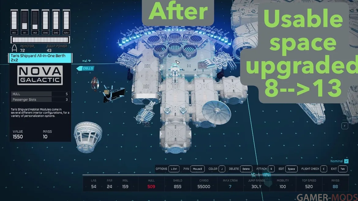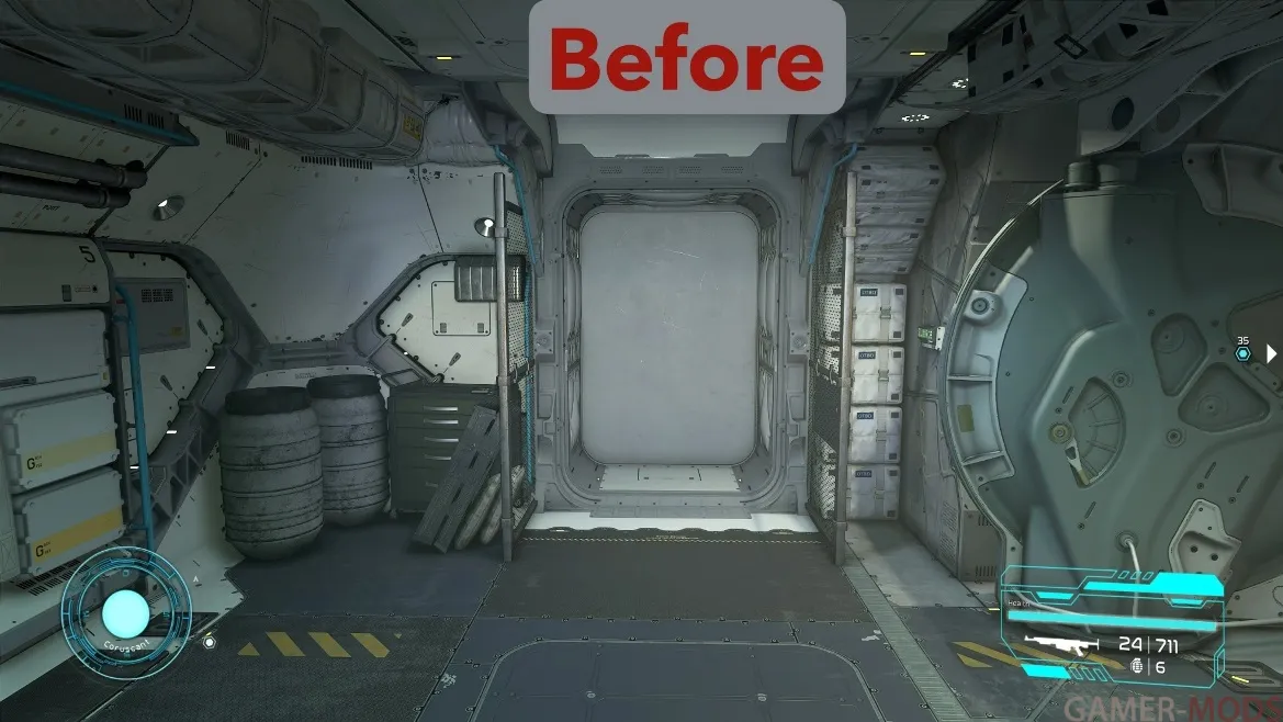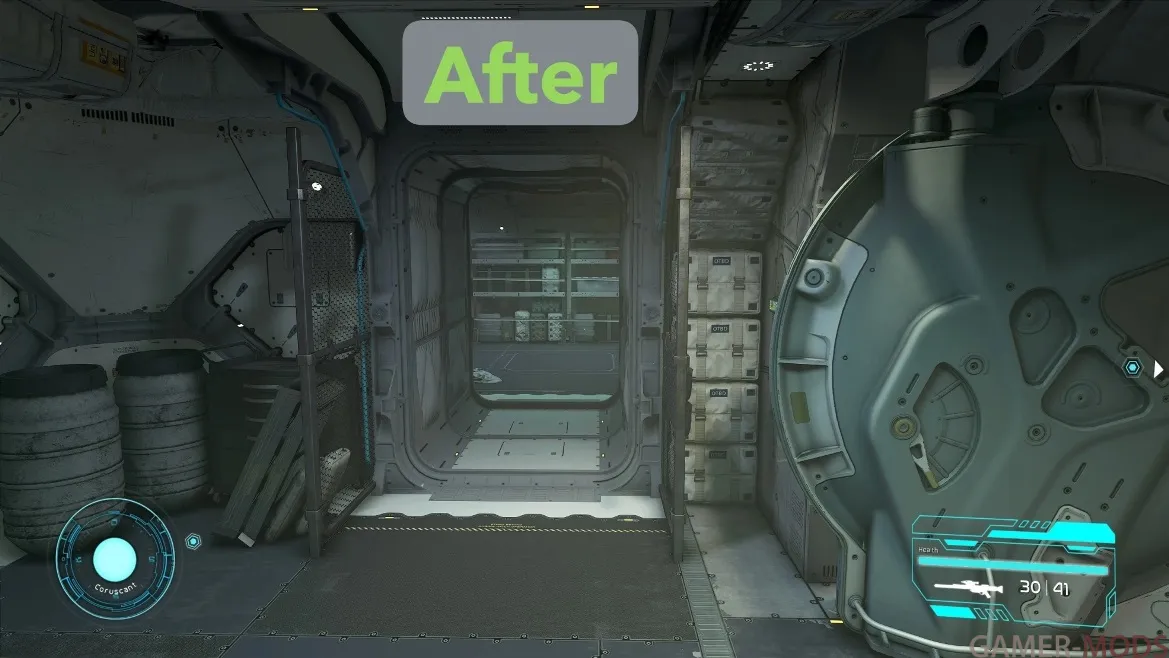 • Удаляет стены, блокирующие двери, добавляя новые помещения. Помимо стен, этот мод также удаляет плакаты актеров из фильмов оригинальной трилогии, чтобы они не блокировали дверные проемы. Если вам нравятся эти пасхалки и/или вас не интересует настройка интерьера корабля с помощью различных «жилых отсеков», то не скачивайте мой мод.