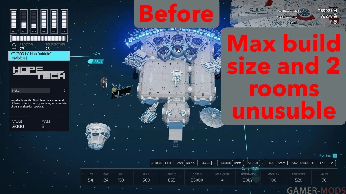 * В оригинальном моде "Star Wars YT-1300 Millennium Falcon 1977" было место для 3x3 + 1x1 жилых отсеков, 2 из которых были неиспользуемыми, итого 8. После удаления стен с помощью этого мода мне удалось получить максимум 13, что дает гораздо больше возможностей для настройки с любым доступным в игре жилым модулем, который вы захотите разместить. Среди других комбинаций, которые вы можете выбрать, я предпочитал 3x1, 2x2, 2x1, 2x1, 1x1, 1x1.
