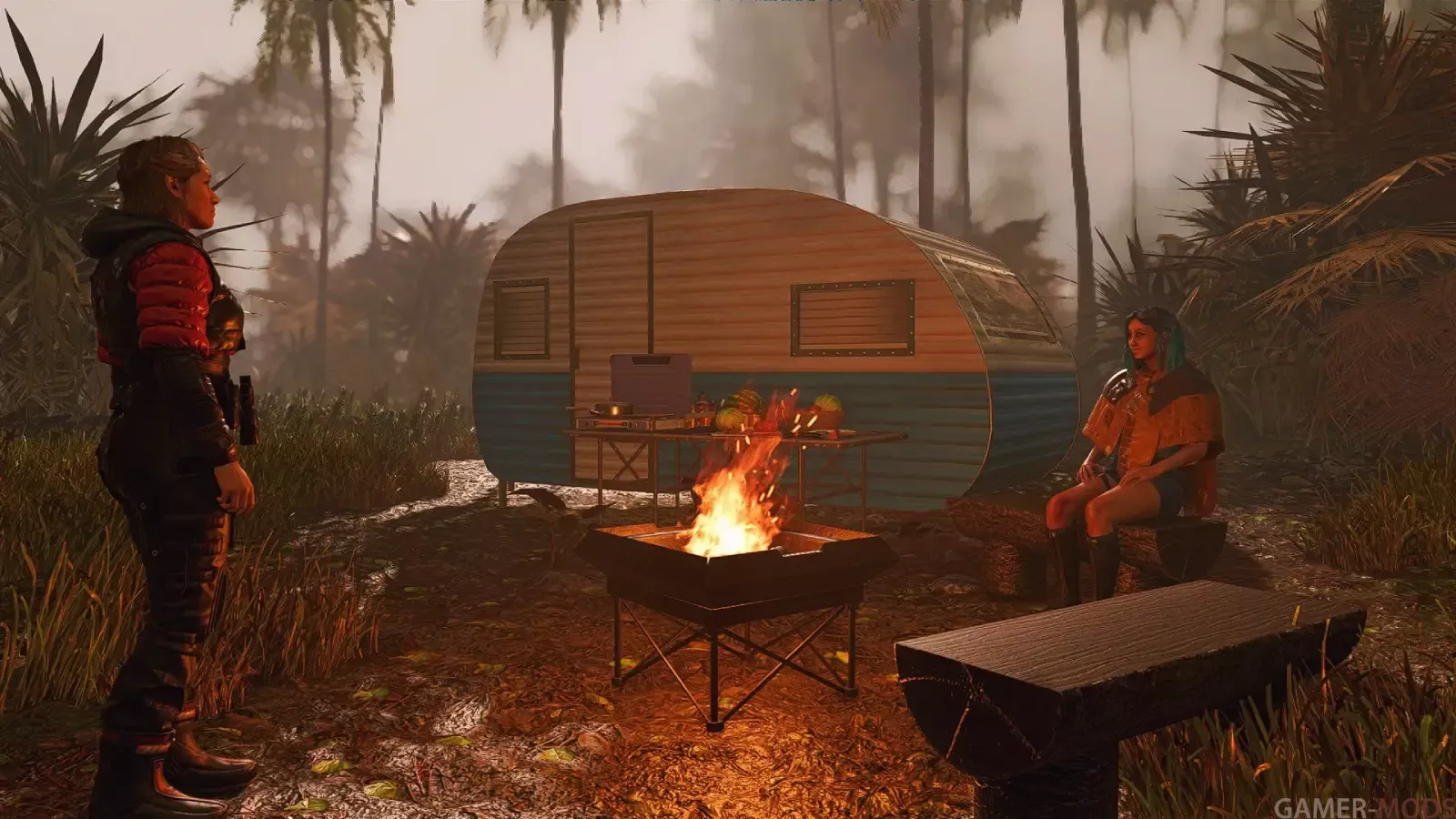 Оформление форпоста: Коллекция функциональных и декоративных предметов, таких как: Старинные туристические трейлеры для сна и хранения, костры для приготовления пищи и многое другое.