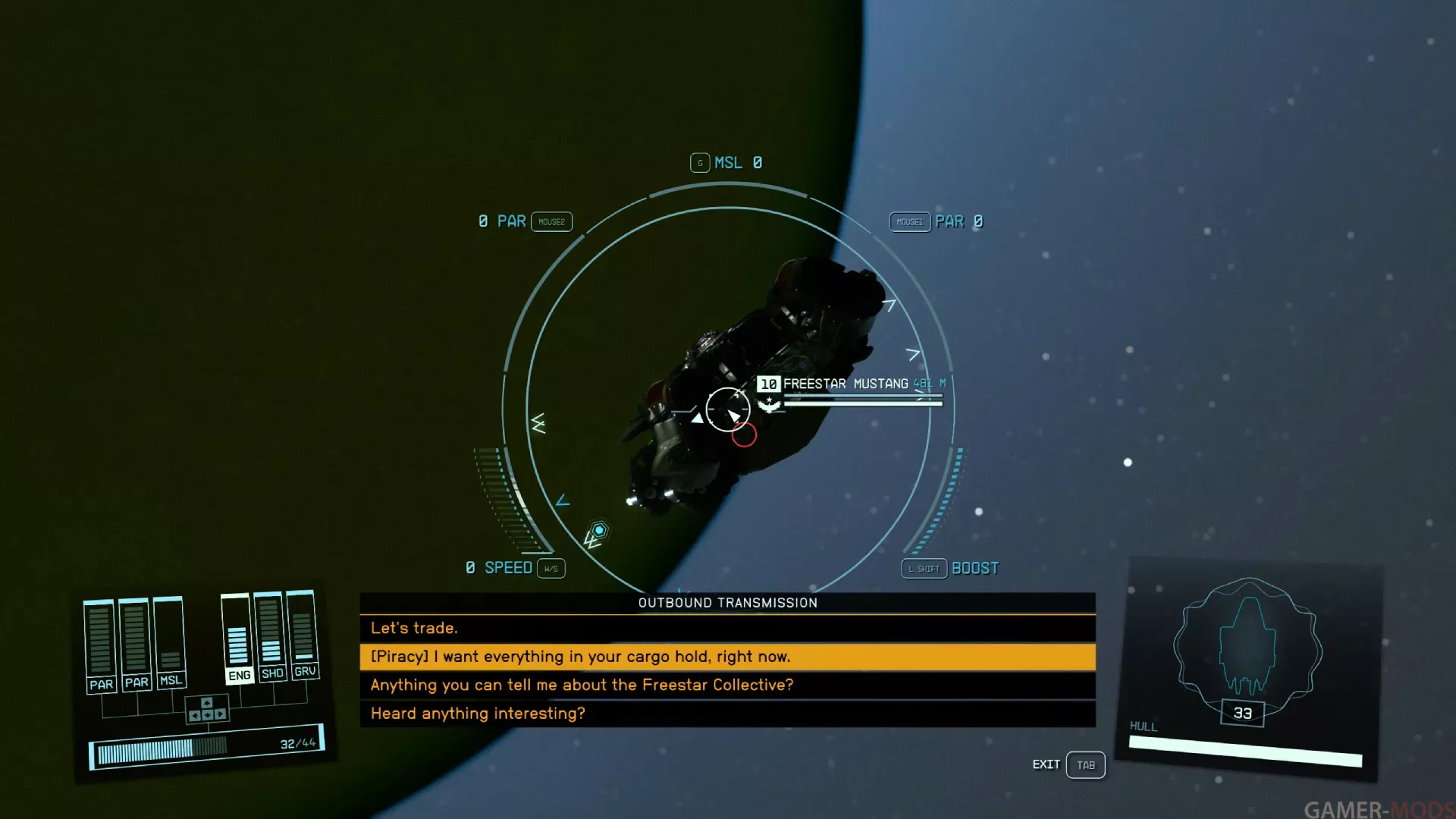 как это работает В vanilla Starfield Выбрав опцию "Пиратство", вы можете попытаться убедить вражеского капитана отдать свой груз.