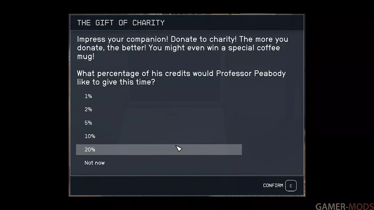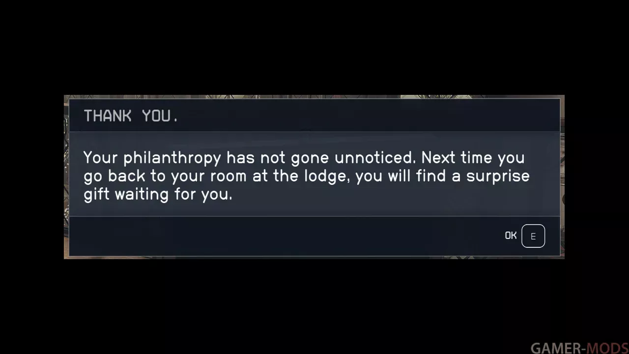 Вы можете жертвовать от 1% до 20% кредитов, имеющихся в инвентаре вашего персонажа, столько раз, сколько захотите, чтобы отыграть роль доброжелательного персонажа.