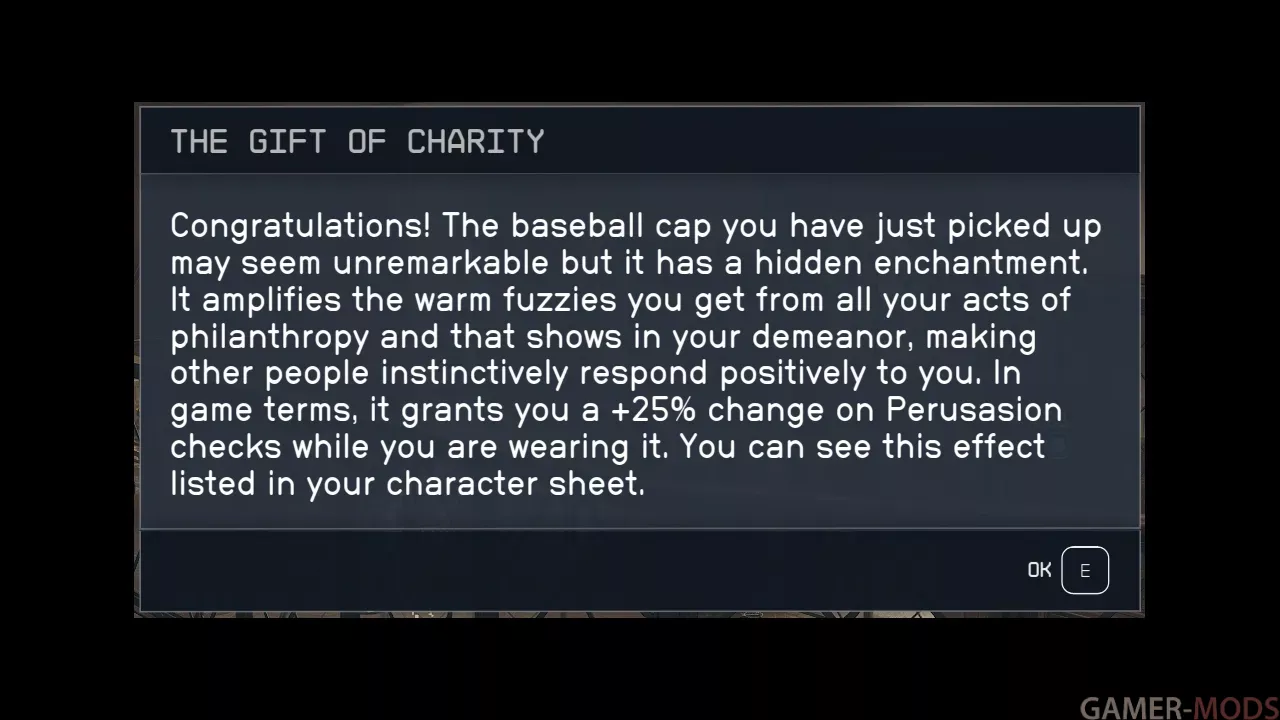 На первый взгляд, это обычная бейсболка, но с секретным заклинанием, которое дает вам +25% к шансу на убедительность, пока вы ее носите (вы можете увидеть эффект в вашей характеристике персонажа).